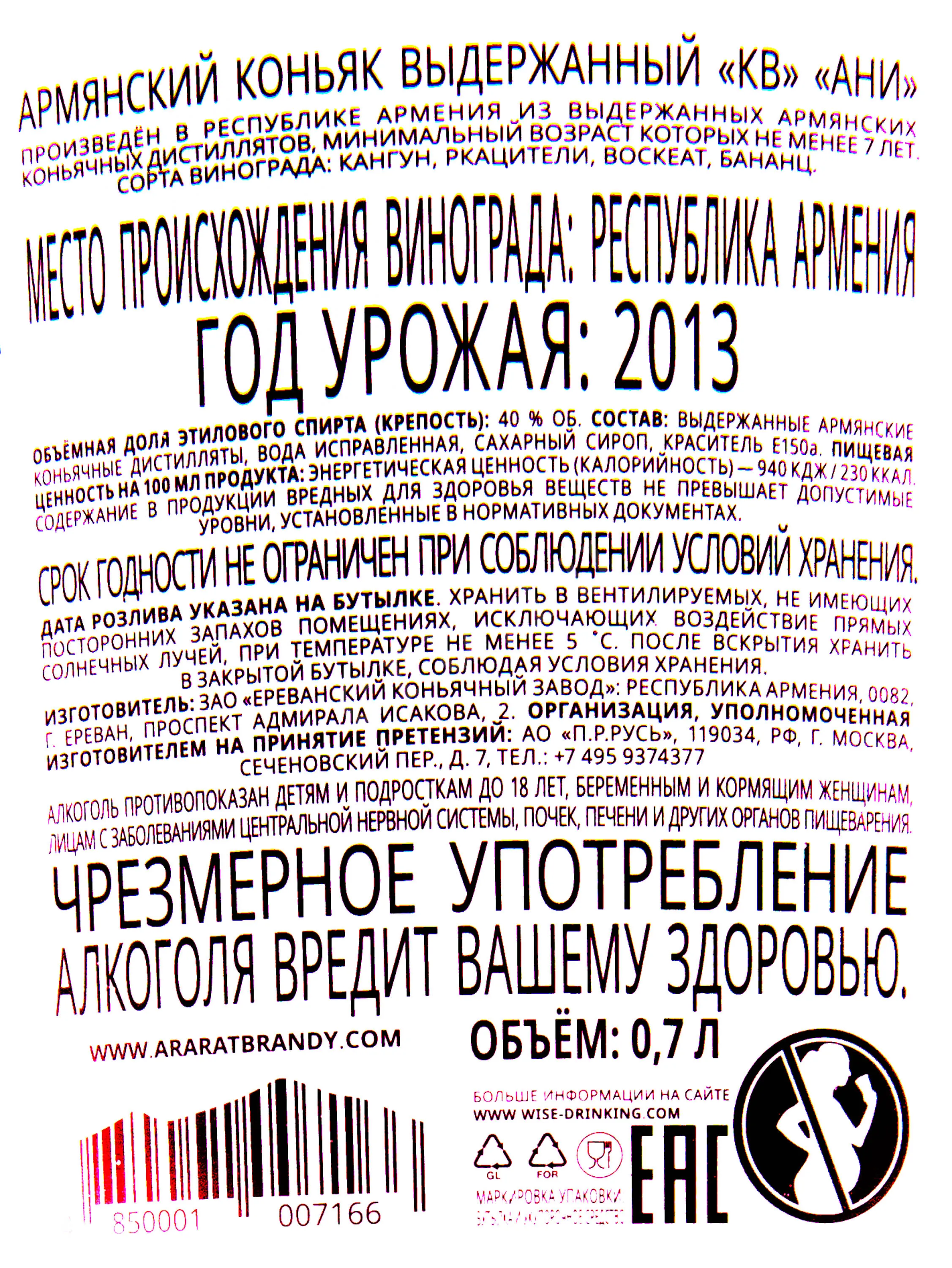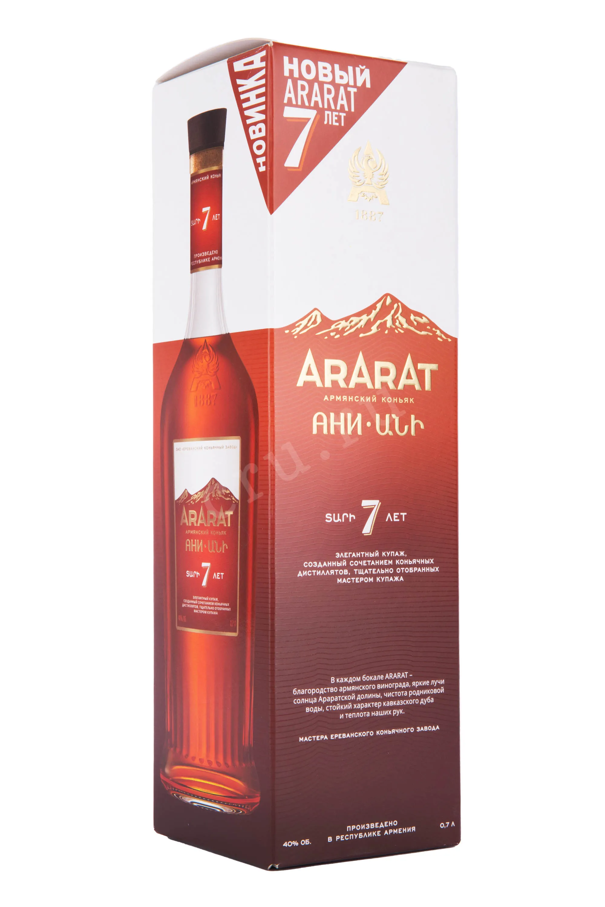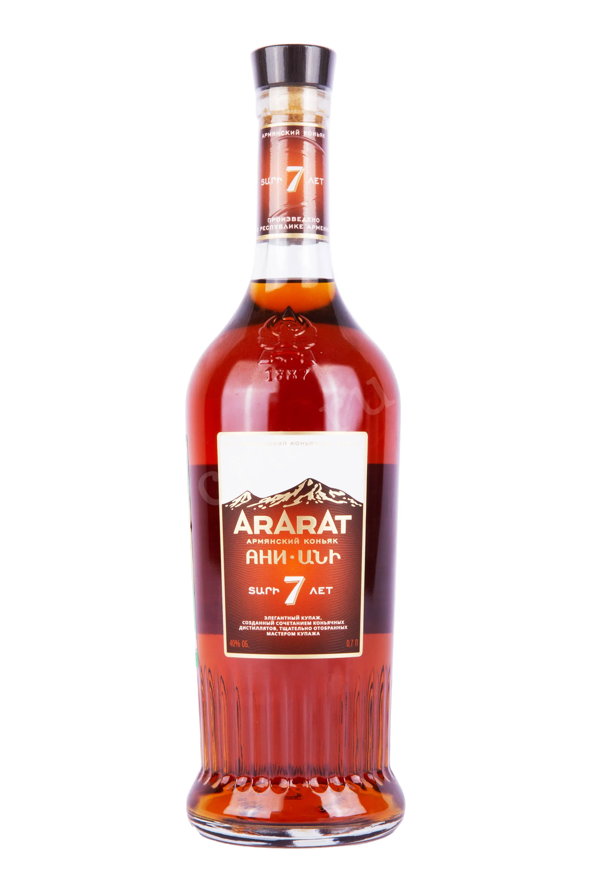 Коньяк Ани Арарат 7 лет 0,7 л в подарочной коробке – вариация стандартной крепости 40 градусов, созданная из четырех сортов винограда. Урожаи для изготовления напитка созревали в богатом армянском терруаре, благодаря чему приобрели сбалансированный и насыщенный вкусоаромат. На заводе собранное вручную сырье перерабатывается по классической методике – с винификацией и последующей двойной паровой перегонкой виноградного сока. На протяжении семи лет спирты состариваются в кавказских дубовых бочках и разливаются после купажирования. Напиток, названный в честь древнего могущественного города Ани – столицы царства Багратидов, станет прекрасным сувениром для особых случаев.
