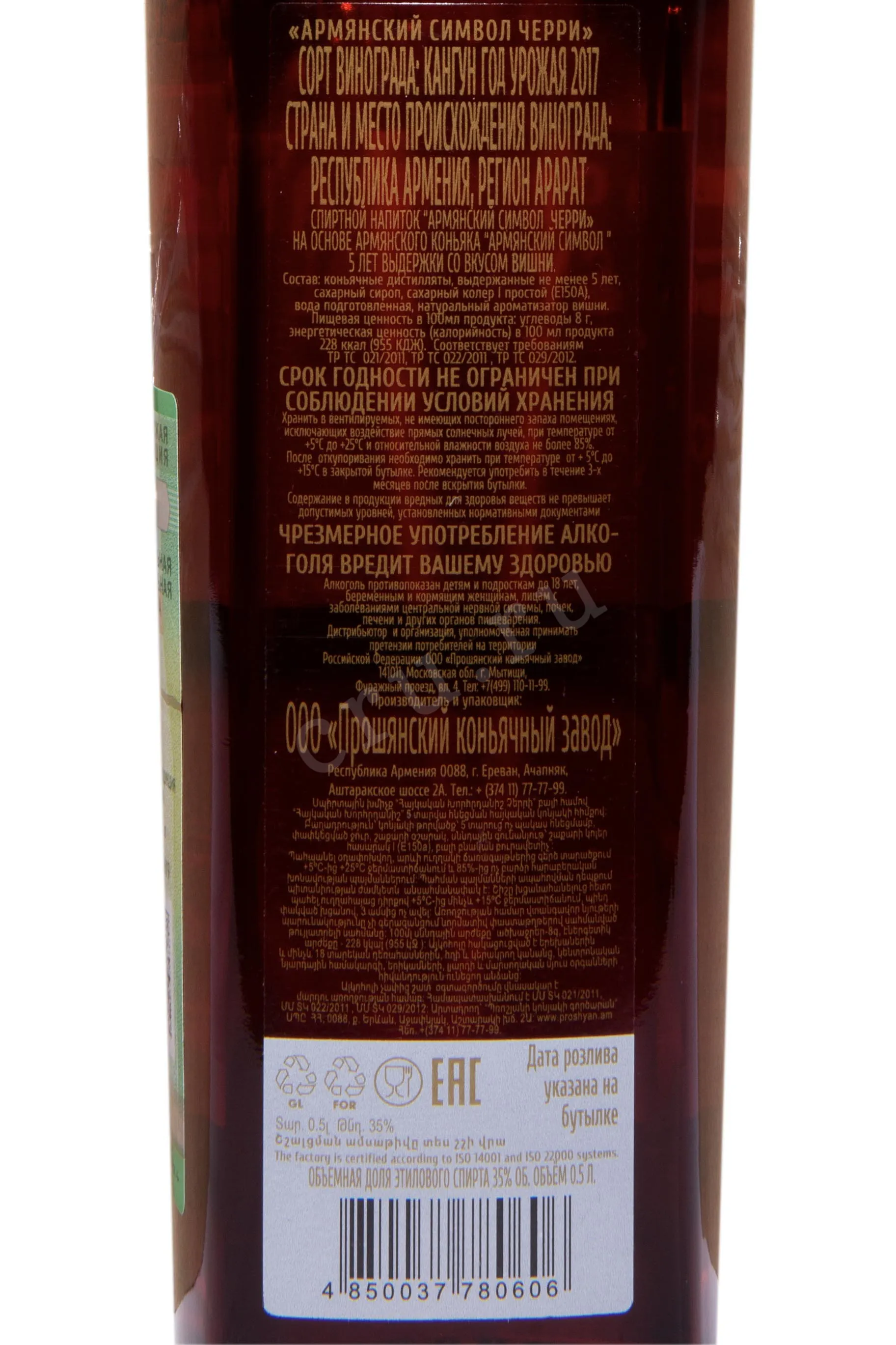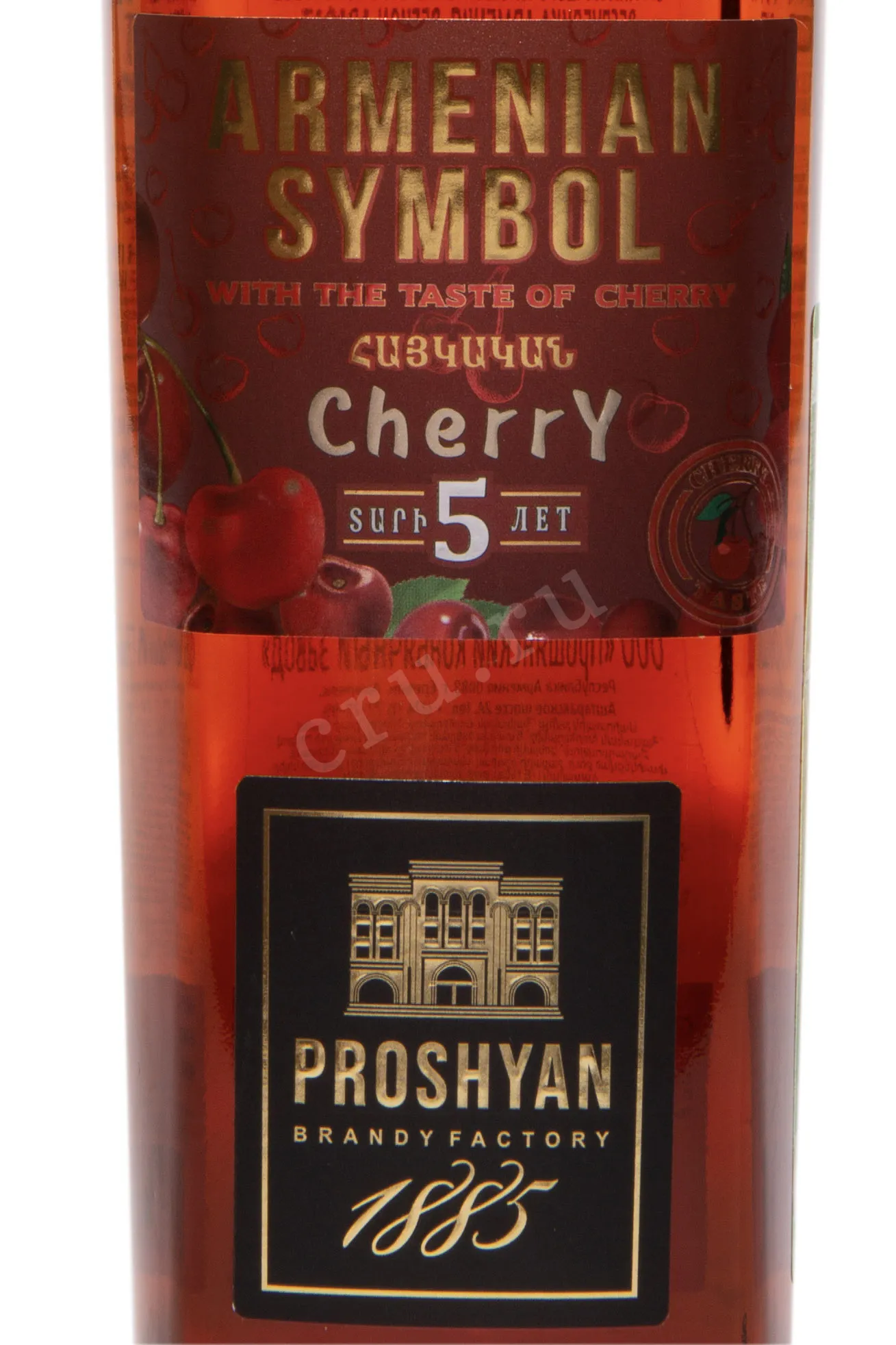 Коньяк Armenian Symbol Cherry 5 лет 0,5 л представляет собой элегантный напиток с вишневыми нюансами в букете. В его основе лежат классические технологии Прошянского коньячного завода: дистилляция сусла из автохтонных сортов Мсхали и Кангун в медных кубах, выдержка спиртов пять лет в бочках из кавказского дуба, купаж с натуральным вишнёвым экстрактом и мягкой питьевой водой. В результате получается необычный коньячный бленд с ягодными акцентами. Напиток отмечен ценителями за насыщенность вкуса и аромата. Он отлично подходит как для дегустации в чистом виде, так и для создания коктейлей.