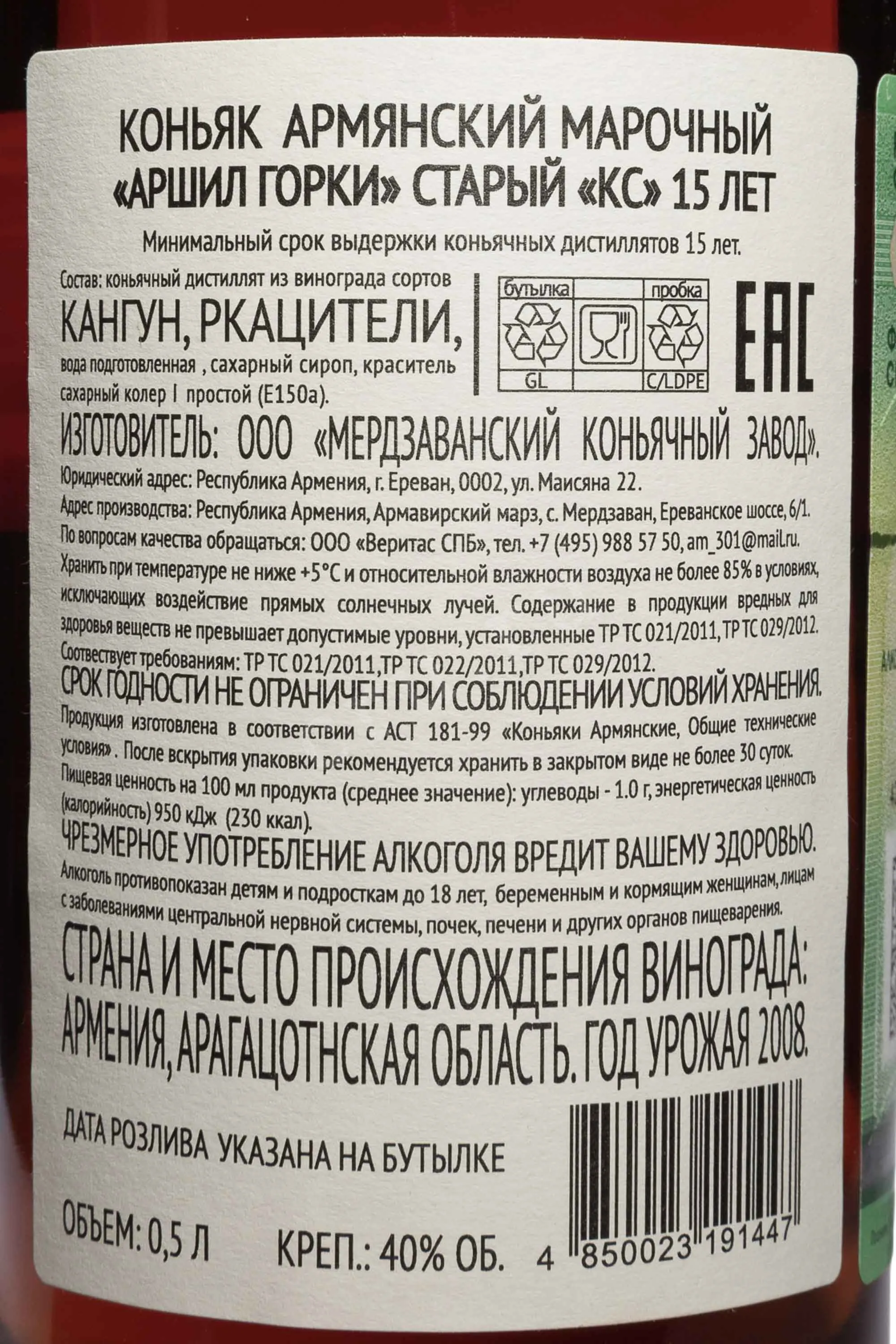 Коньяк Arshile Gorky 15 лет в подарочной упаковке 2008 года 0.5 л представляет собой выдержанный напиток с сосредоточенной и спокойной стилистикой. Он создан из спиртов, прошедших длительную выдержку, что формирует мягкий характер и глубокий профиль. Базовые партии дистиллята выдерживаются не менее 15 лет в бочках из кавказского дуба. Это придаёт напитку округлость и сложную палитру. Производитель использует традиционный метод перегонки в медном кубе и строгий отбор спиртов. Лимитированный выпуск делает коньяк заметным среди коллекционных релизов, а его вкусовая стабильность часто отмечается экспертами. В подарочной упаковке напиток приобрёл статус редкого винтажного экземпляра, который ценят коллекционеры.