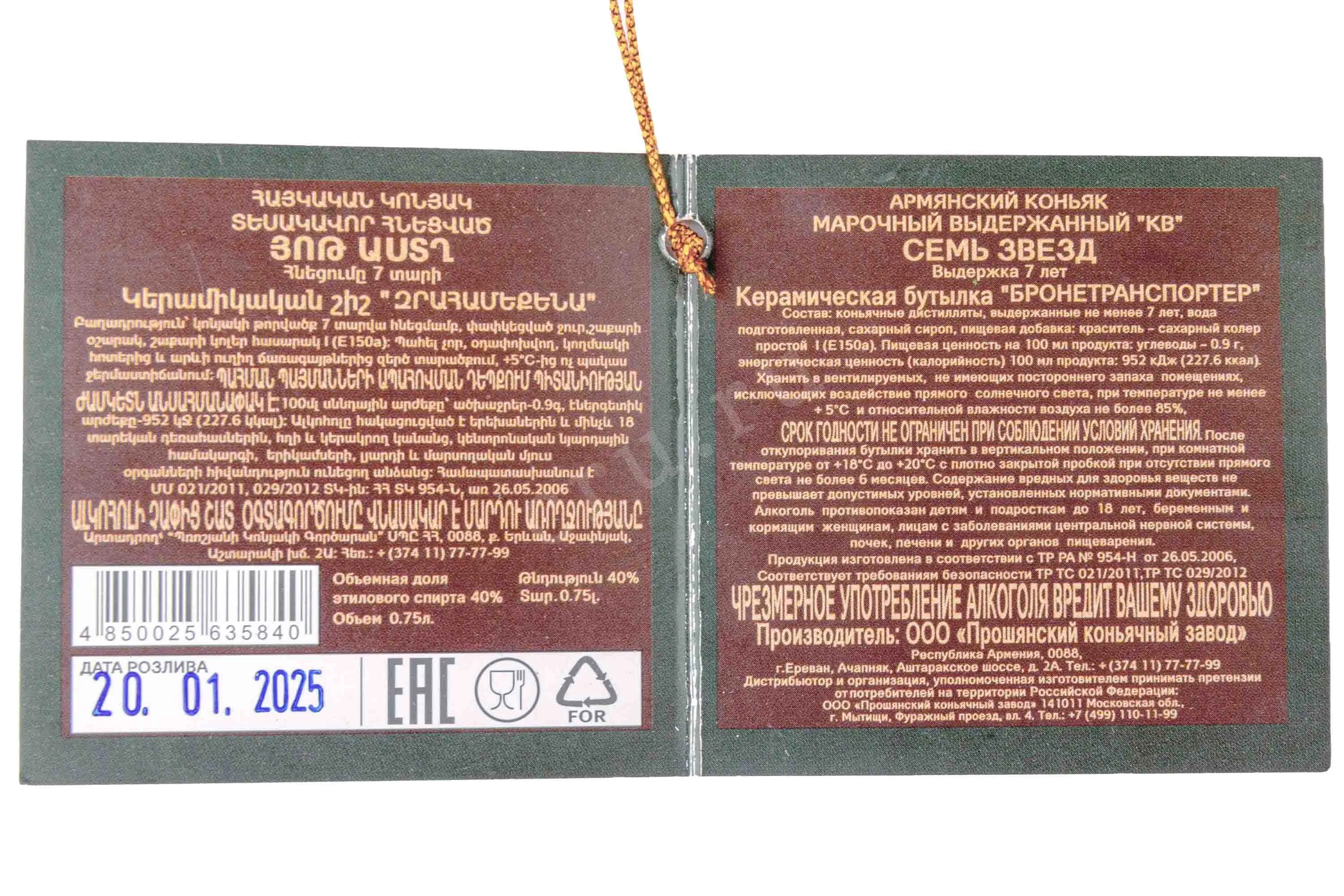 Коньяк Прошян Бронетранспортер 7 лет в подарочной упаковке 0.75 л был создан по традиционным технологиям армянского коньячного производства. Отборный виноград собирали вручную на солнечных склонах Араратской долины, где вулканические почвы и особый микроклимат способствовали формированию уникального вкуса ягод. Семилетняя выдержка в кавказских дубовых бочках наполнила напиток глубокими оттенками, богатым ароматом и выразительным характером, присущим легендарным армянским коньякам.