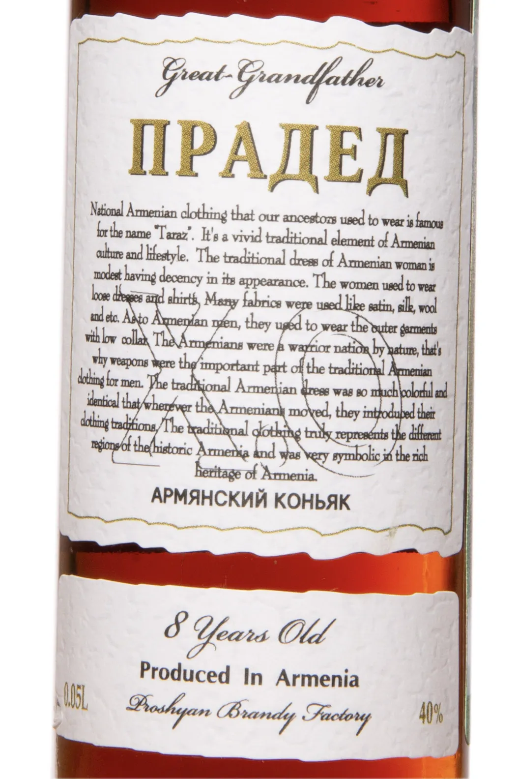 Коньяк Прадед 8 лет 0.05 л — армянский выдержанный дистиллят, созданный на Прошянском коньячном заводе по традиционной технологии медной перегонки. Для спиртов использовалось сырьё с солнечных виноградников Араратской долины, где вулканические почвы и тёплый континентальный климат формируют высокую сахаристость и выраженный ароматический профиль ягод. Восемь лет выдержки в бочках из кавказского дуба придали напитку характерную бархатистость, насыщенные древесные оттенки и гармоничную структуру.