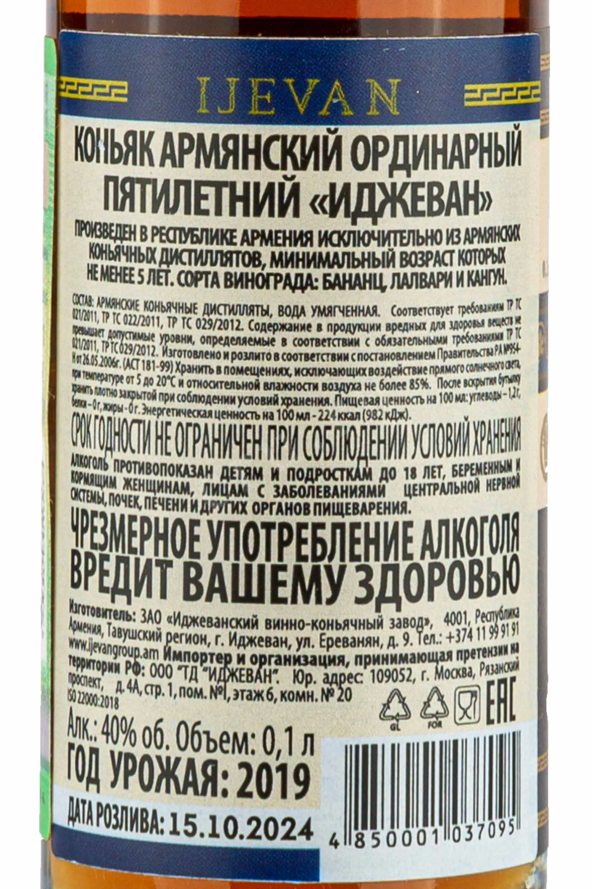 Коньяк Ijevan 5 лет 0,1 л — классический, мягкий, сбалансированный и округлый. Производится на заводе в городе Иджеван из местных сортов винограда: Бананц, Лалвари и Кангун. Дистиллят выдерживается в дубовых бочках не менее пяти лет. Это придаёт напитку ванильные и лёгкие древесные оттенки. Особенность этой версии коньяка — компактный формат бутылки объёмом всего 100 мл. Благодаря небольшому размеру, её удобно использовать в качестве сувенира или небольшого подарка. Также этот вариант удобно приобрети для ознакомительной дегустации.
