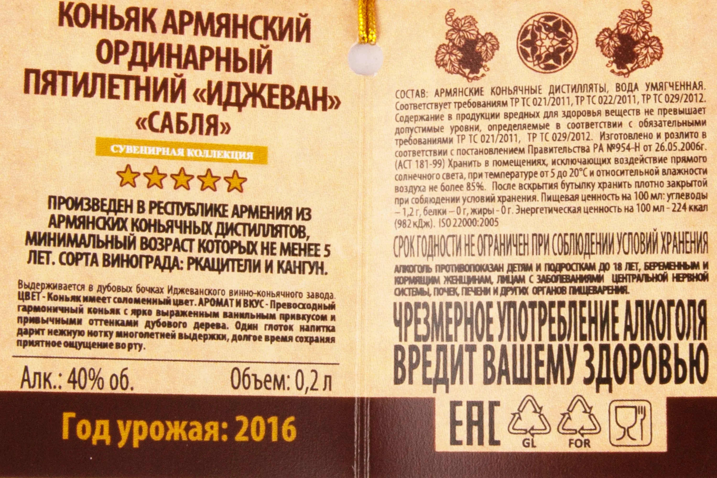 Коньяк Иджеван Сабля в подарочной упаковке 0,2 л — сувенирный вариант известного армянского напитка. Его бутылка имеет вид сабли, а объем оригинальной емкости меньше стандарта. Алкоголь с уровнем содержания спирта 40% произвели в Армении из спелого винограда двух распространенных белых сортов, которые вырастили на экологически чистых участках Араратской долины. Ферментироавнное сусло вызревало в дубовых бочках около 5 лет.