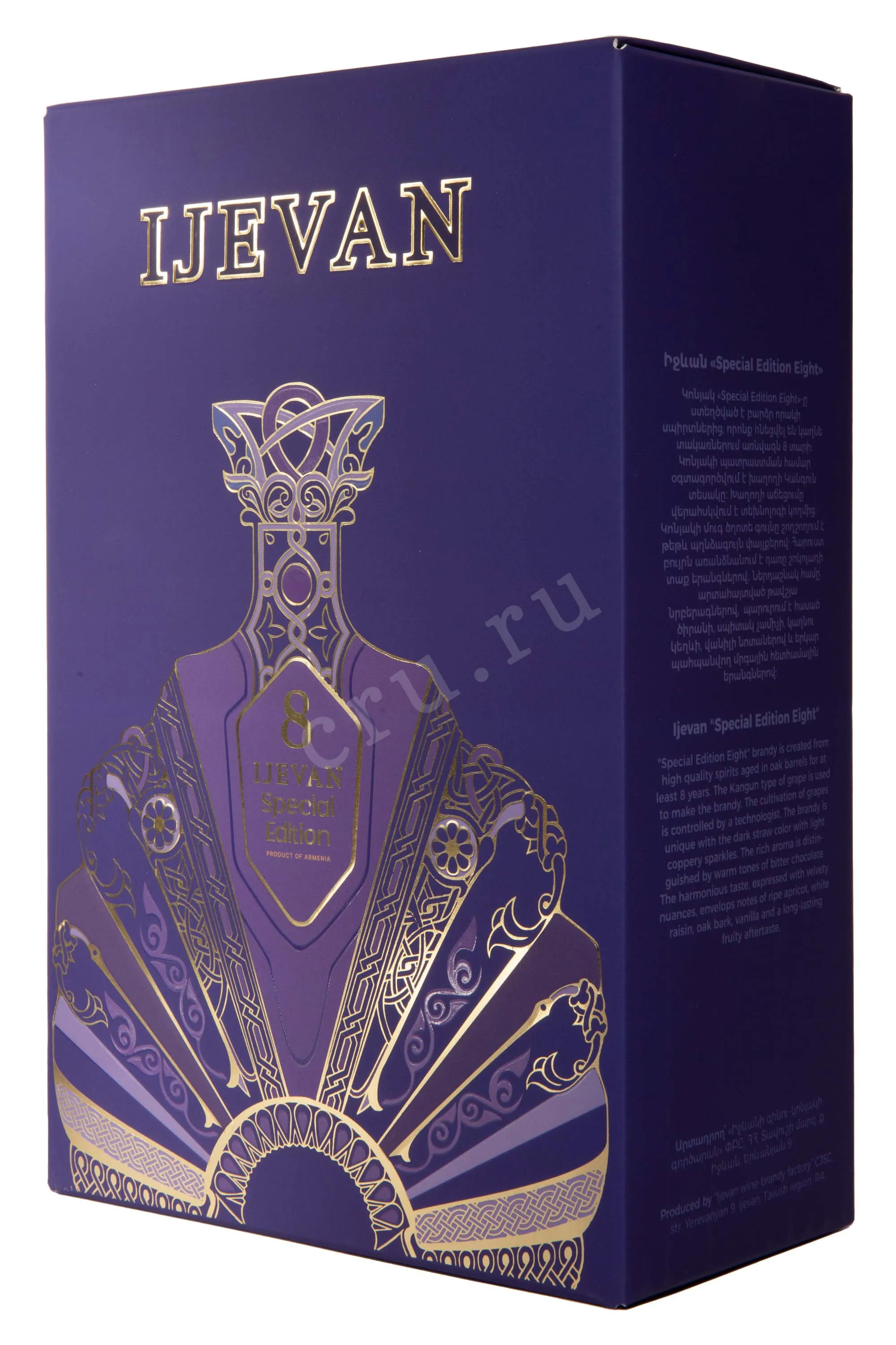 Коньяк Ijevan Special Edition 8 лет 0,7 л в подарочной упаковке выпускается ограниченной серией. Он представлен в красивом декантере с эксклюзивным дизайном, что еще раз подчеркивает премиальный статус армянского алкоголя. Это роскошный подарок, предмет коллекционирования и подходящий экземпляр для длительного хранения. Для производства используют автохтонный сорт Кангун. Коньячные спирты выдерживают исключительно в дубовых бочках, не менее 8 лет. Благодаря особой технологии коньяк приобретает уникальную бархатистость вкуса, насыщенность и неповторимый ароматический букет. Напиток был высоко оценен экспертами и любителями армянских коньяков.