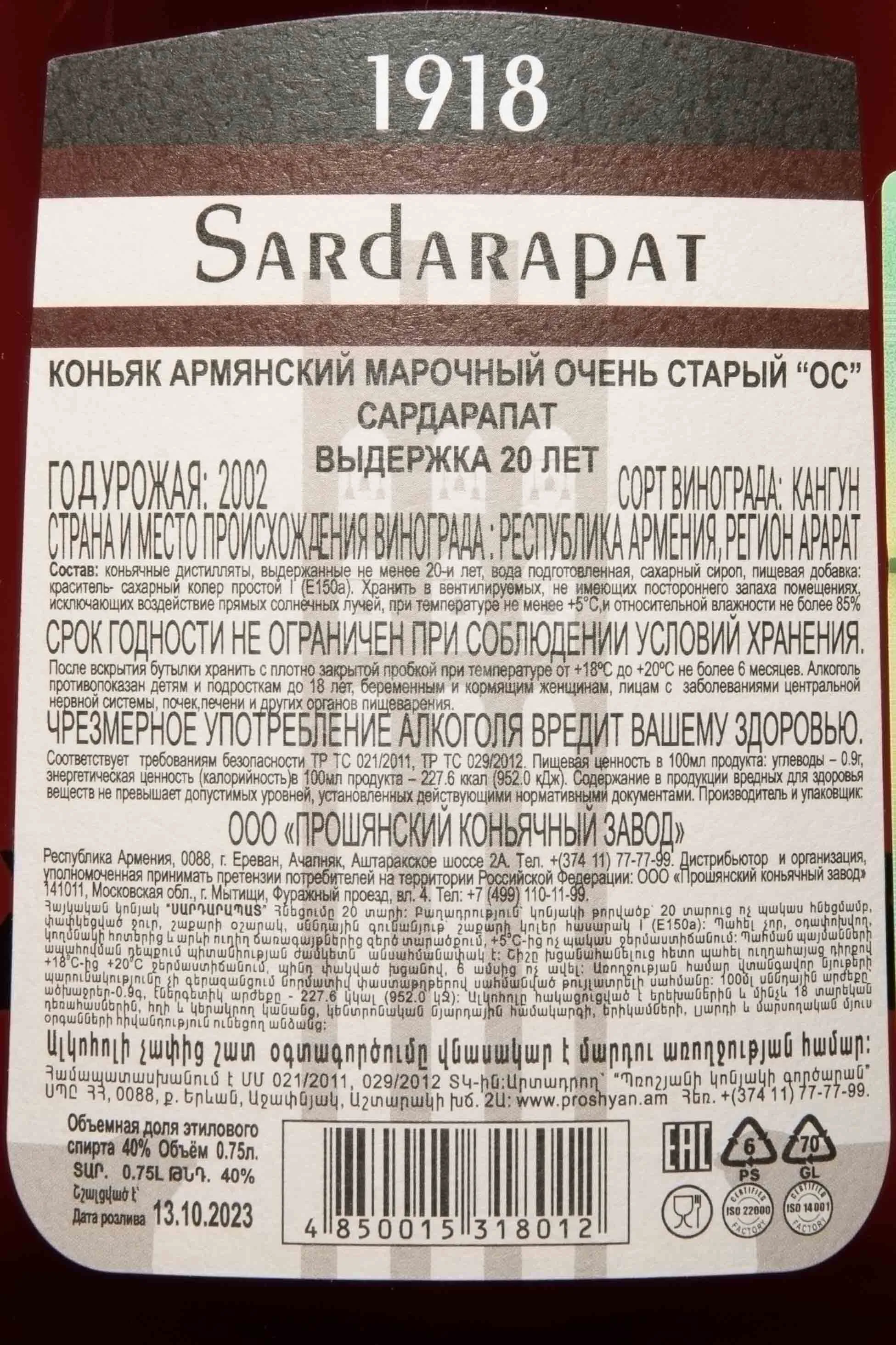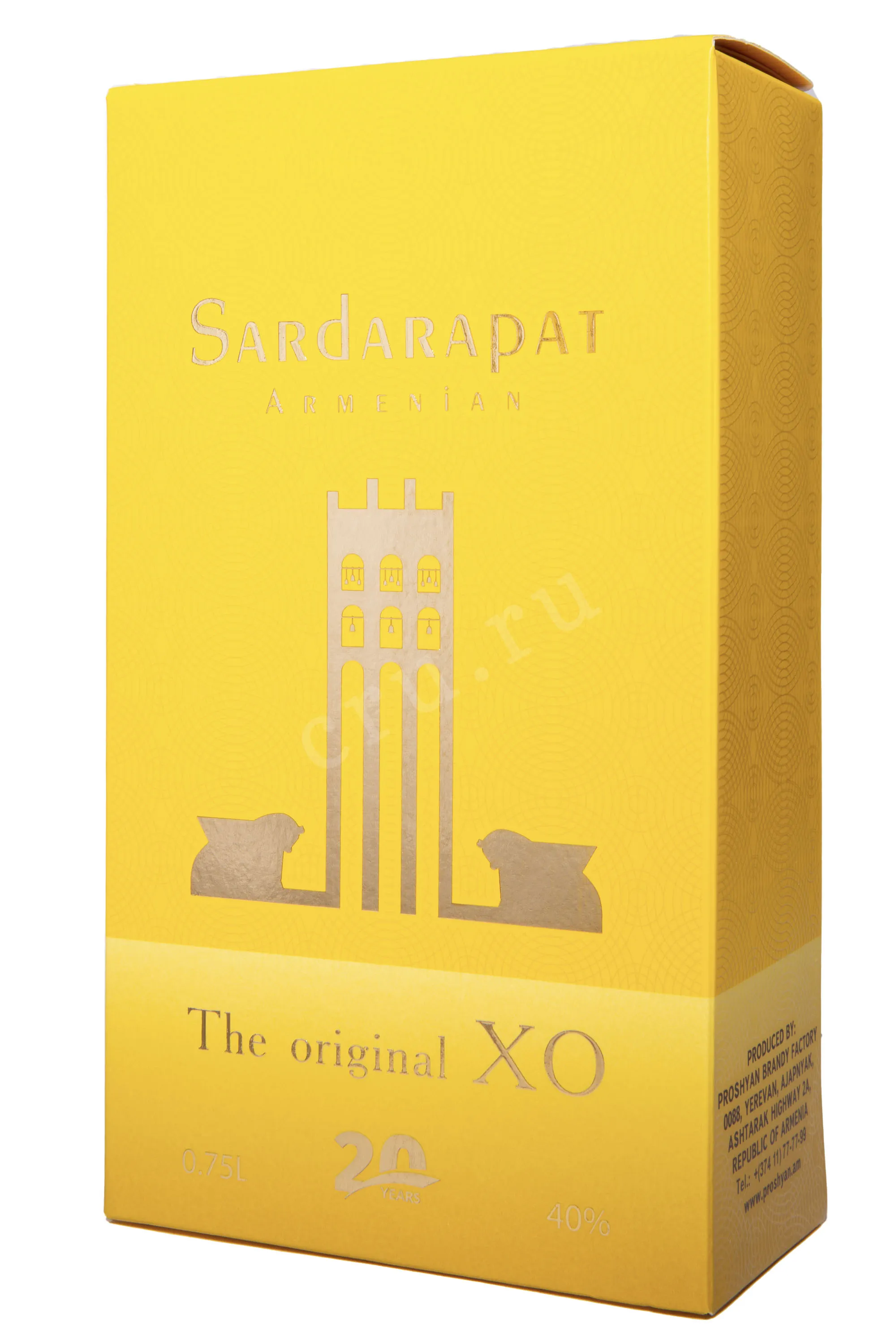 Коньяк Сардарапат ХО 20 лет 0.75 л – премиальный армянский cognac, изготавливается Прошянским коньячным заводом по классической технологии мастерами купажа. При создании используются лучшие местные сорта белого винограда, произрастающие в Араратской долине. Отборные коньячные дистилляты созревают в специальных бочонках из черного карабахского дуба на протяжении 20 лет. Коньяк Sardarapat XO, название которого прославляет победу армянского народа над турками в Сардарапатском сражении 1918 года, поступает в яркой презентабельной упаковке и является превосходным подарком на фарфоровую свадьбу, а также ценителю крепкого армянского алкоголя.