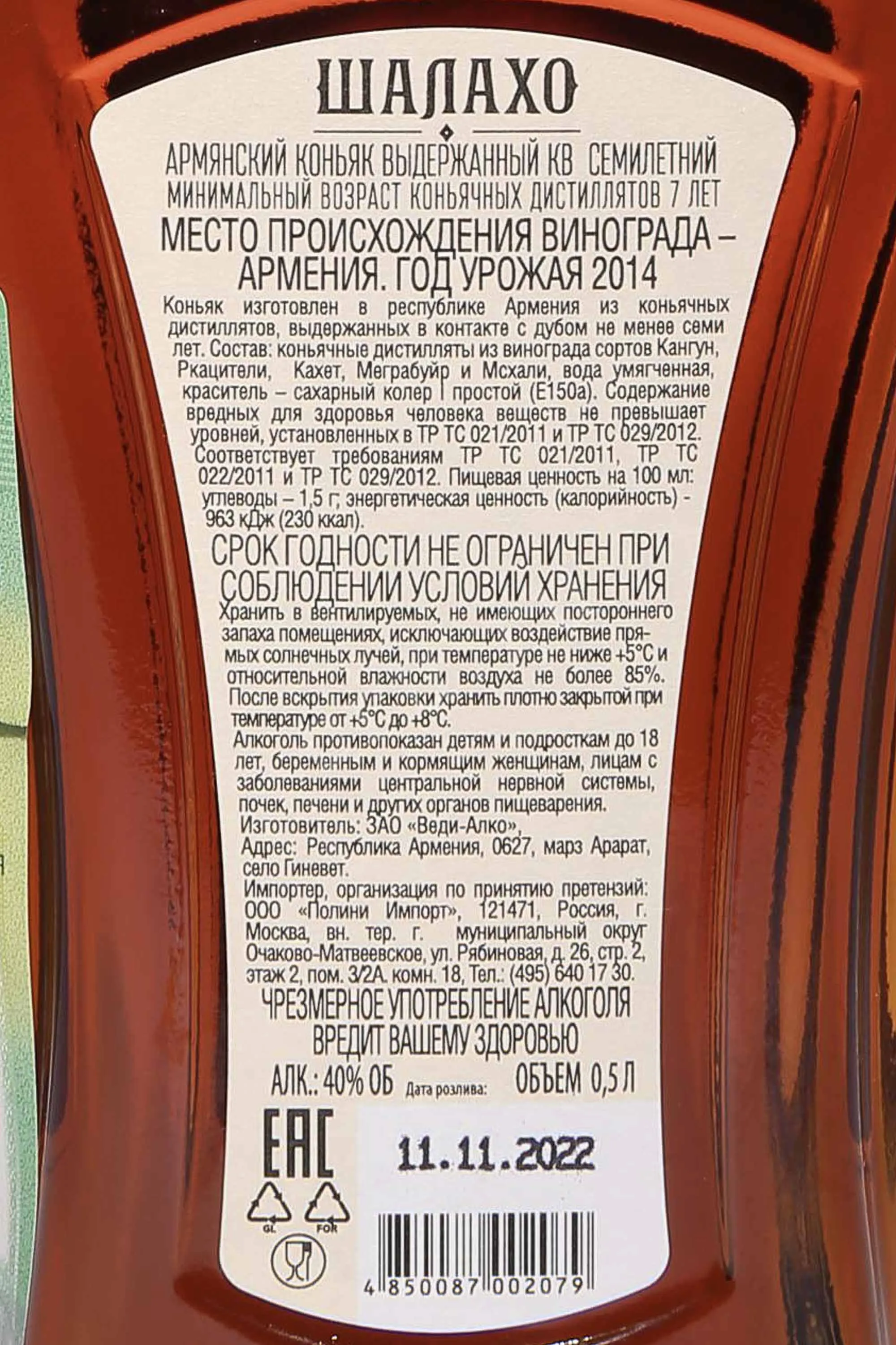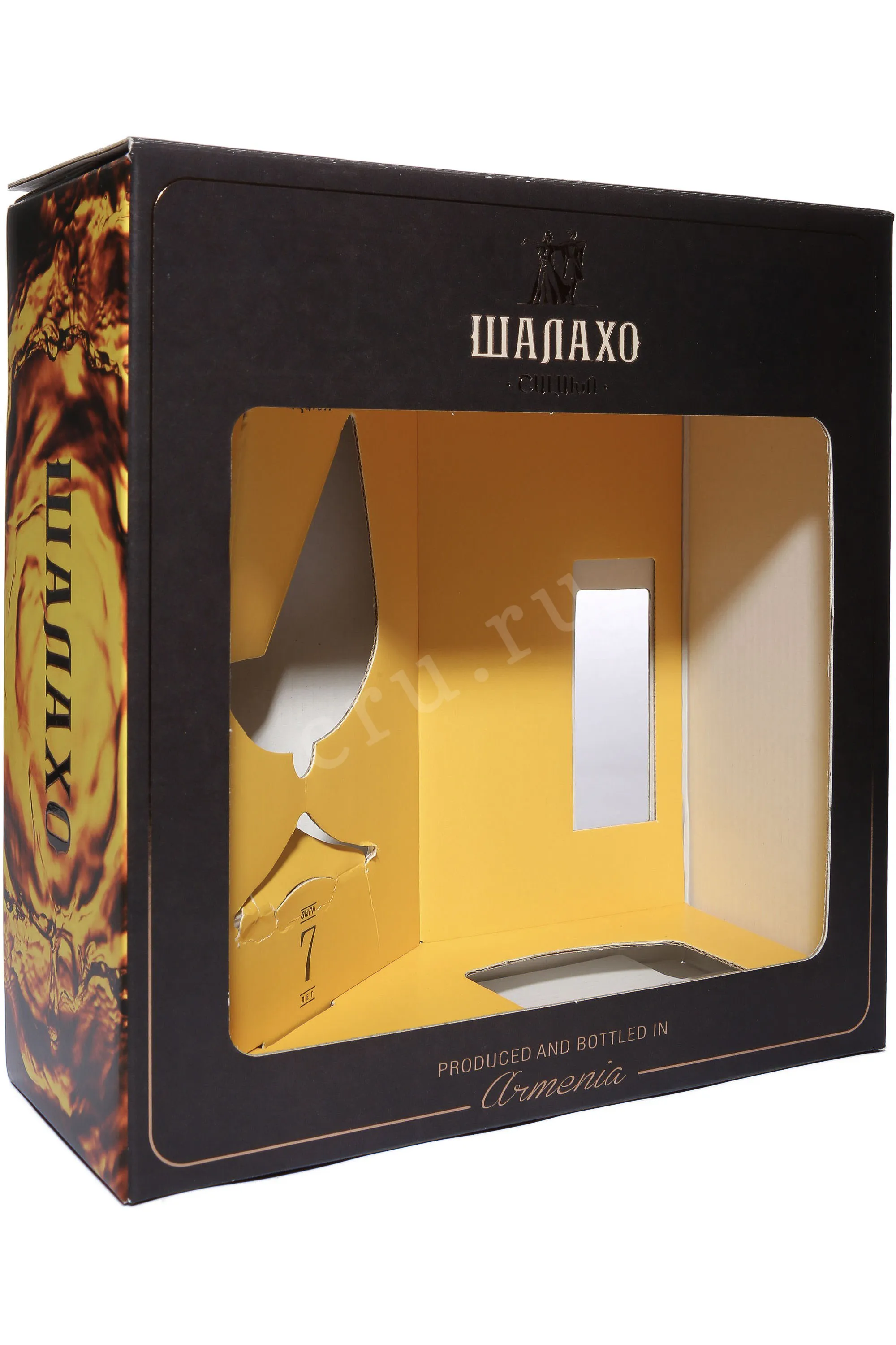 Коньяк Шалахо 7 лет 0,5 л в подарочной упаковке с бокалом создается по традиционной технологии выдержки в дубовых бочках. Напиток производится из отборного винограда, выращенного в условиях теплого климата Армении, где сочетание солнечных дней и прохладных ночей обеспечивает оптимальное накопление сахара и гармоничную кислотность ягод. Урожай собирают вручную, после чего ягоды проходят мягкое прессование, а их сок – этапы брожения и двойной перегонки в медных аламбиках. Дальнейшее созревание происходит не менее семи лет, что формирует мягкий вкус и устойчивый букет. Для производства используют виноматериалы, созданные на основе классических белых сортов, отличающихся богатым ароматическим потенциалом. Особое внимание уделяется качеству древесины емкостей: именно дубовые бочки придают спиртному золотисто-янтарный оттенок, ноты ванили и легкий акцент специй. Выпуск в сувенирном оформлении с фирменным аксессуаром подчеркивает статус бренди и делает его подходящим вариантом для коллекции или особого повода.