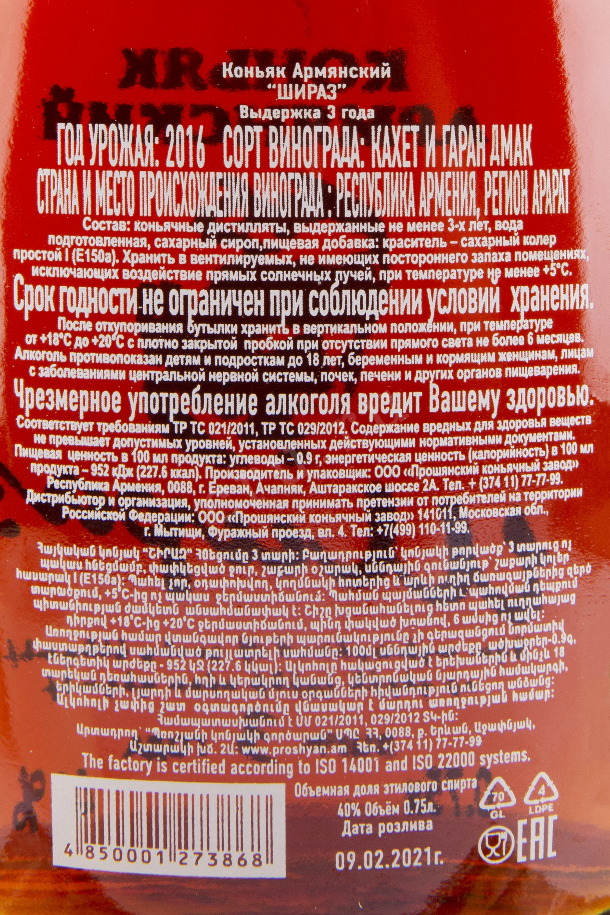 Коньяк Шираз 3 года 0,75 л — высококачественный армянский алкоголь, который создается известным предприятием с длительной историей. Богатый вкус напитка формирует классическая обработка винограда Араратской долины, включающая стадии ферментации, перегонки и непродолжительного вызревания в бочках (от трех лет). Уровень спиртуозности коньяка соответствует стандарту — 40%.