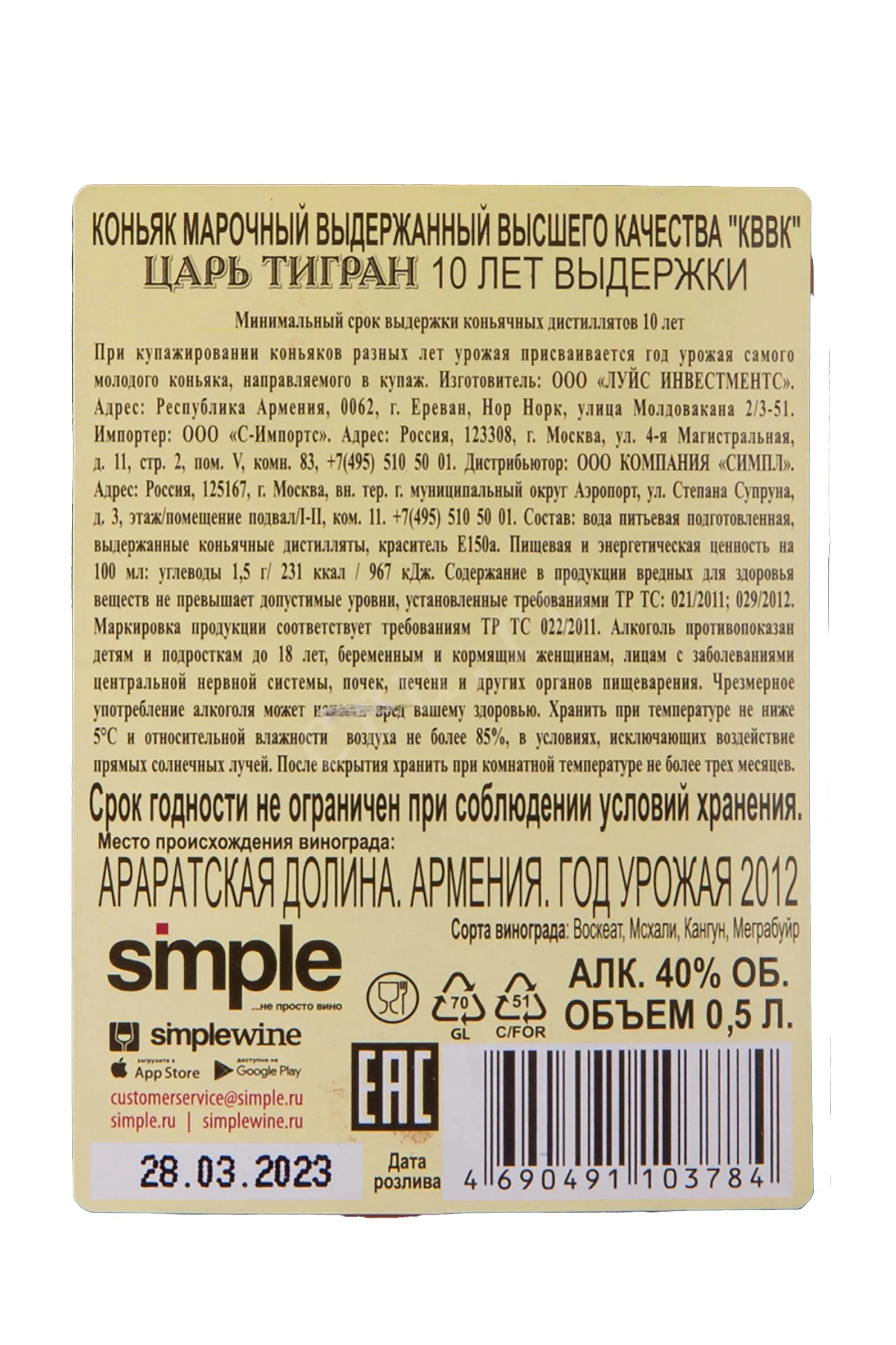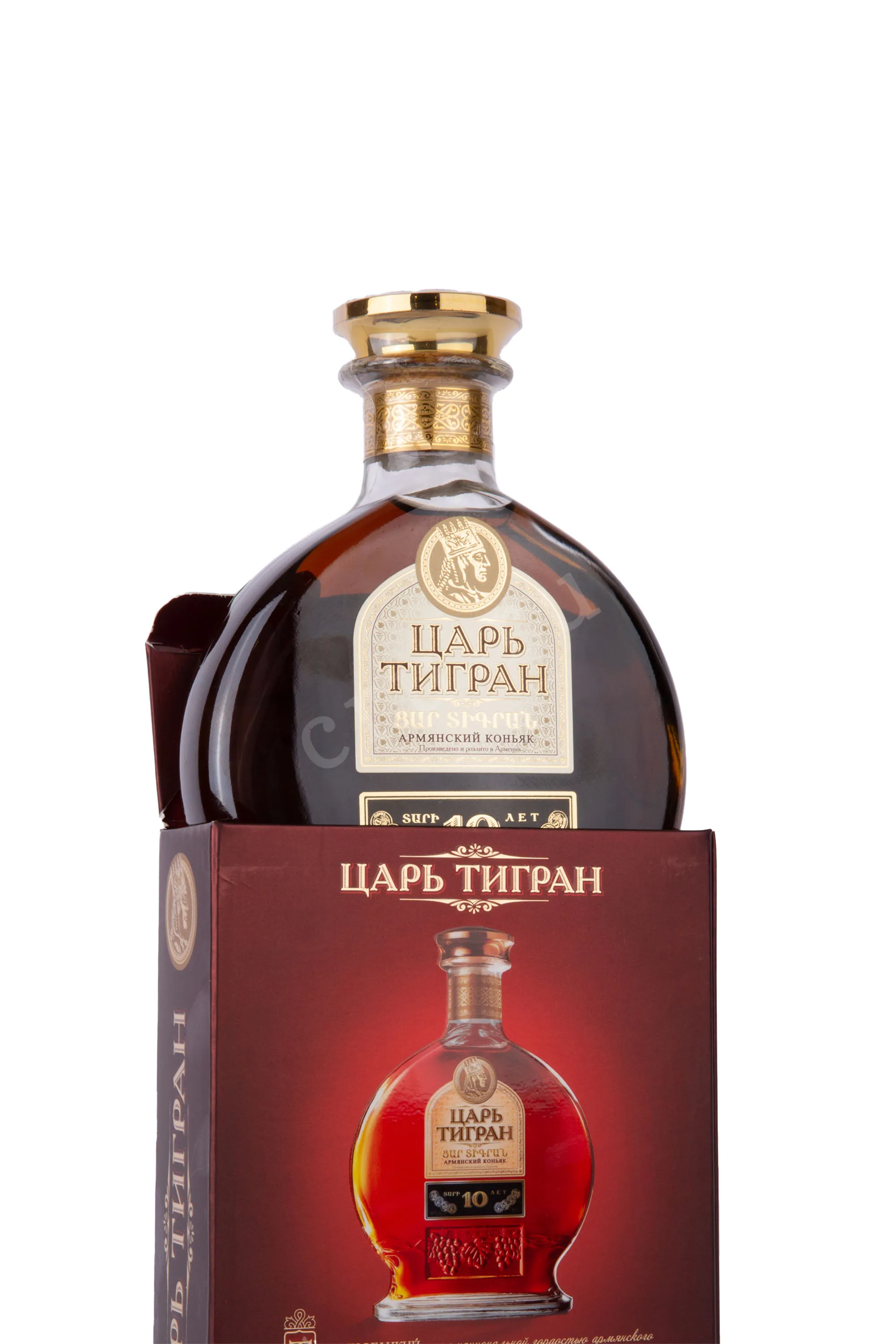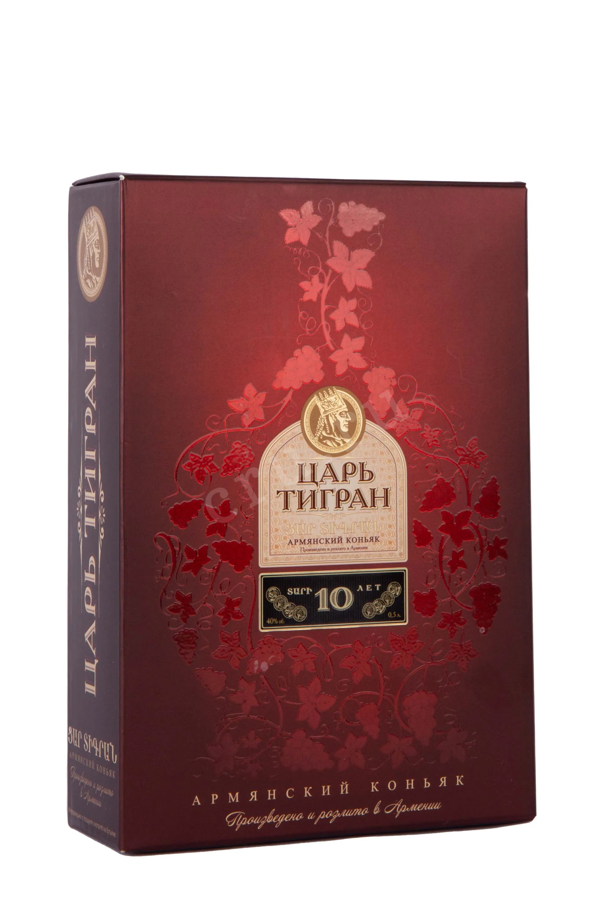 Коньяк Царь Тигран 10 лет 0,5 л предлагается компанией из армянского города Еревана при сорокаградусном содержании алкоголя. В составе напитка представлены спирты со средним возрастом 10 лет (максимальный срок выдержки дистиллятов в купаже достигает 30 лет). Для изготовления применялось традиционное оборудование, при помощи которого ферментированное сырье обработали путем перегонки и вызревания в дубе.