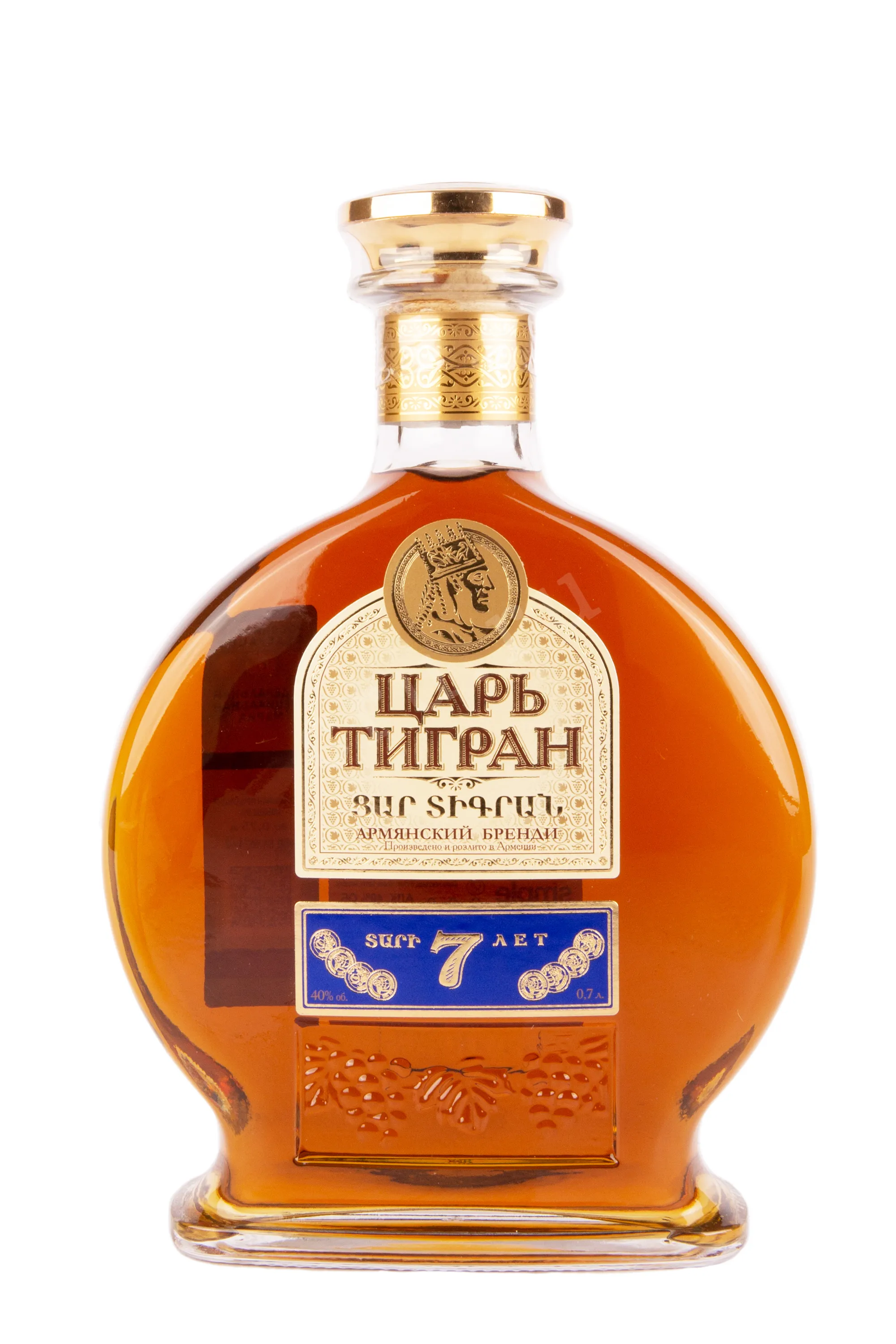 Коньяк Царь Тигран 7 лет 0,7 л выпускается армянским предприятием из города Еревана в соответствии с классическим алгоритмом, предписывающим сбраживание и перегонку винограда Араратской долины. Богатый букет 40-градусного напитка сформировала выдержка в кавказских дубовых бочонках сроком не менее 7 лет.