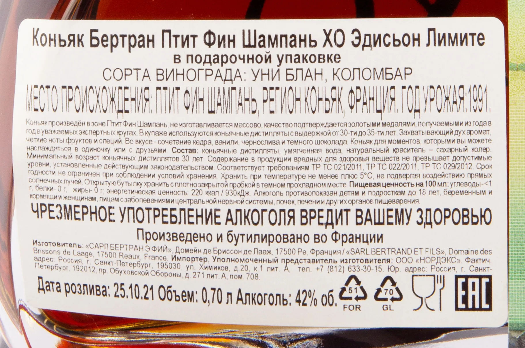 Коньяк Bertrand Petite Fine Champagne XO Edition Limitee gift box 0.7 l – это зрелый алкоголь от французского производителя, выпускаемый в фигурном декантере в сопровождении с фирменной сувенирной коробкой. Напиток изготовлен из урожая 1991 года путем выдержки виноградных дистиллятов в бочках из лимузенского дуба от 30 до 35 лет. 42-процентный cognac завоевал золотые медали на конкурсах спиртного в Париже и Чикаго.