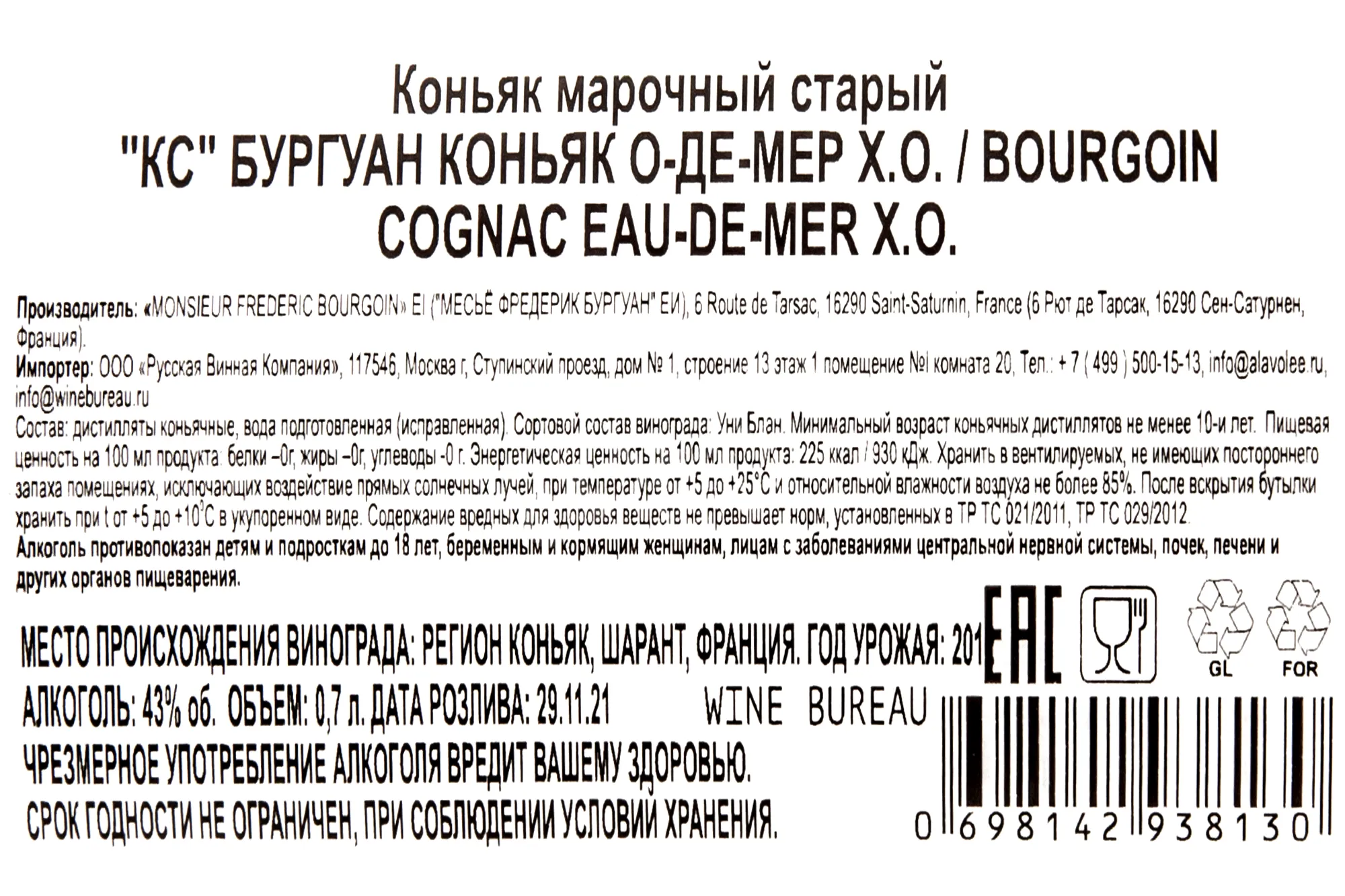 Коньяк Bourgoin Eau-De-Mer XO 0.7 l – это зрелый моносортовой французский cognac из урожая одного года. 43-процентный напиток был создан в дань уважения эре торгового флота, а в изготовлении алкоголя была использована морская вода. Перед розливом спирты выдерживались в бочках из лимузенского дуба не менее 4-х лет. Этот релиз был выпущен лимитированным тиражом (всего 100 бутылок).
