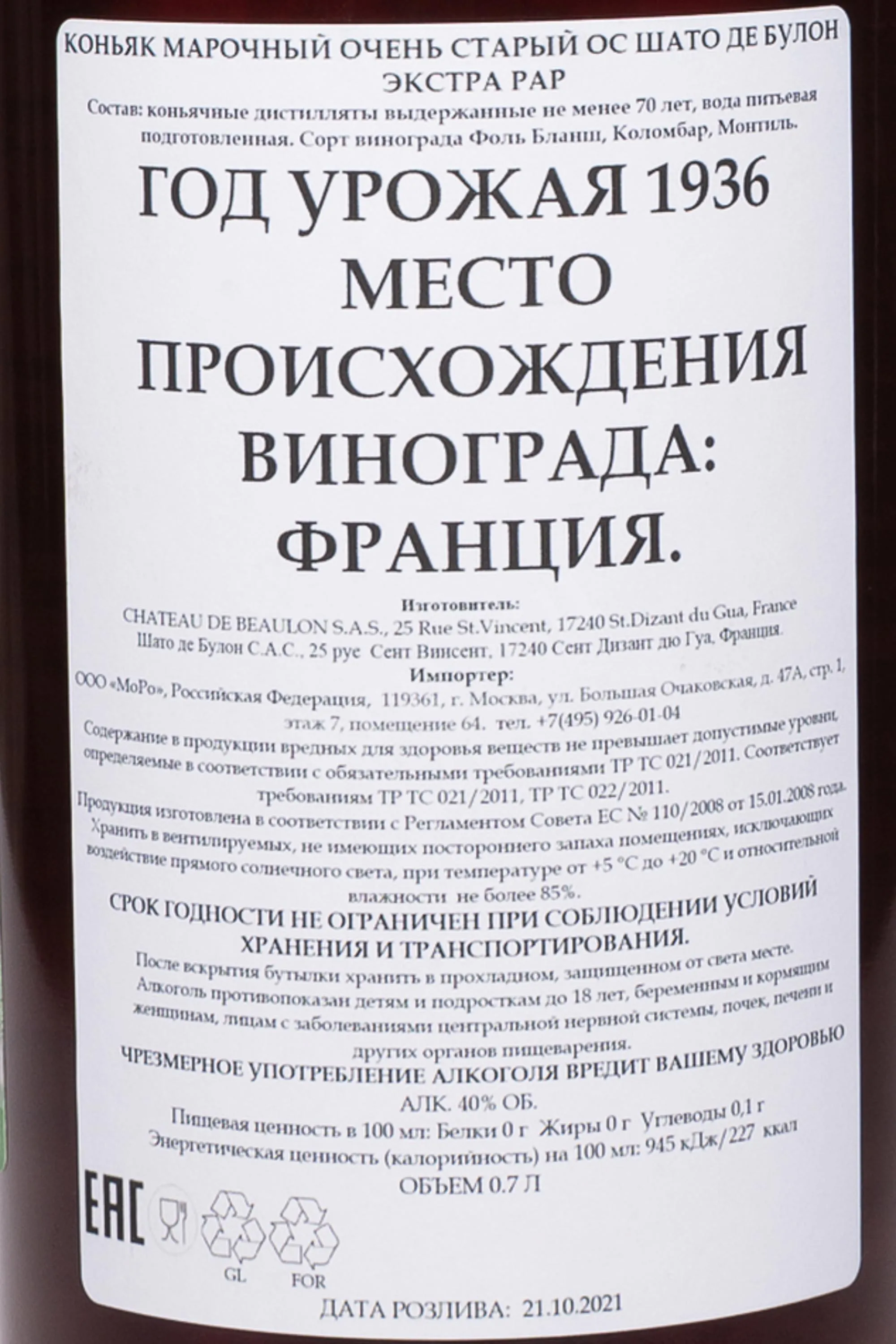 Коньяк Chateau De Beaulon Extra Rare в деревянной коробке 0.7 л — это исключительный пример мастерства дома Chateau de Beaulon, основанного на многовековых традициях. Напиток создан из винограда сортов Фоль Бланш, Коломбар и Монтиль, выращенных в терруаре Фин-Буа. Для его производства используют коньячные спирты урожая 1936 года, выдержанные более 70 лет в дубовых бочках «Райского погреба». Этот коньяк считается вершиной мастерства мастеров-дистилляторов, объединяющей опыт нескольких поколений. Ограниченный выпуск и подлинность подтверждены сертификатом, прилагаемым к каждой бутылке. Элегантная форма стекла и деревянная коробка подчеркивают статус напитка, предназначенного для коллекционеров и ценителей редких релизов. Шато Де Булон Экстра Рэр признан «шедевром времени», сочетающим глубину вкуса и безупречную гармонию.