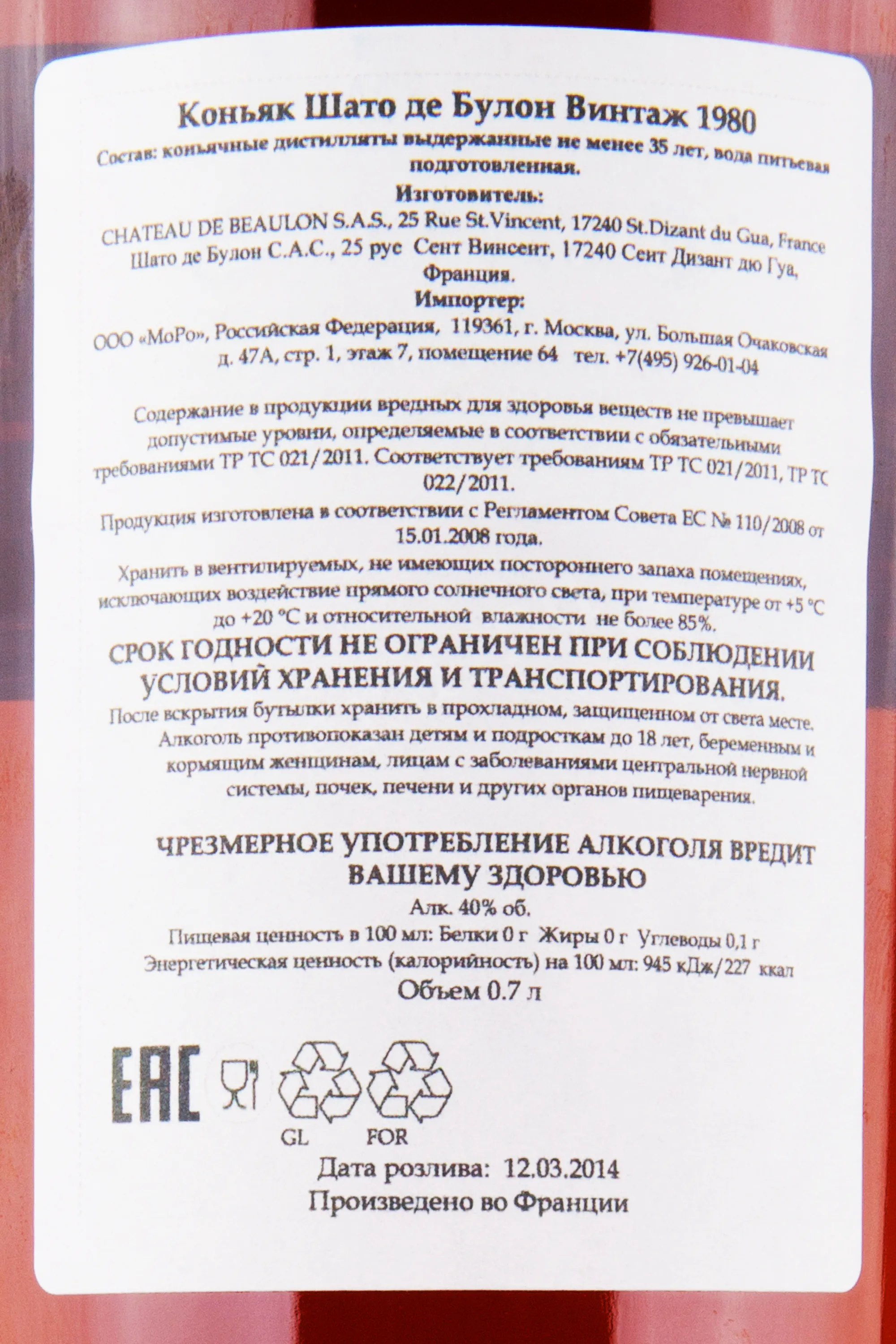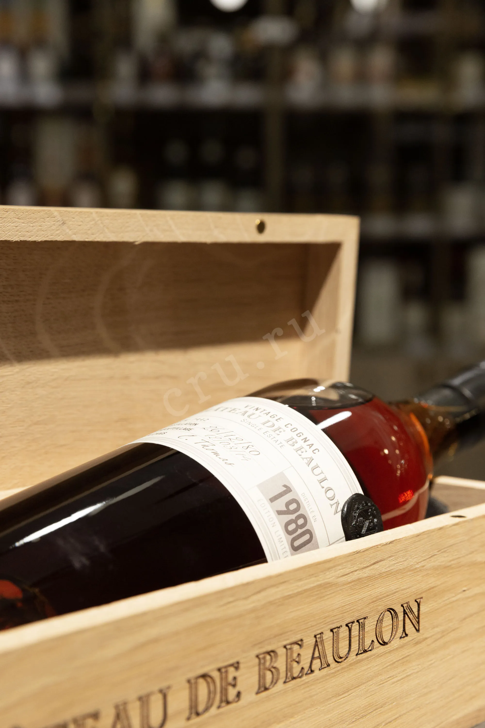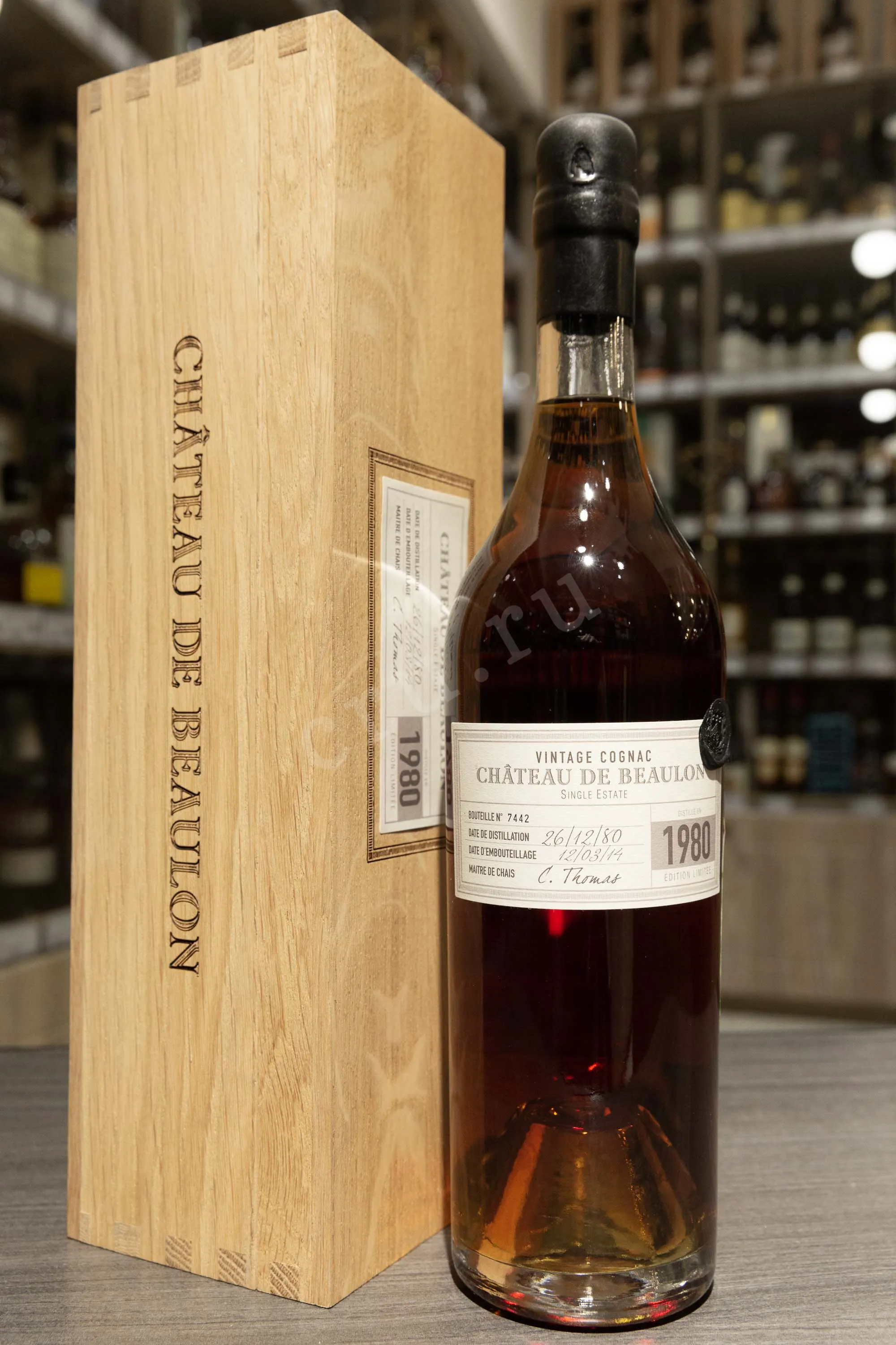 Коньяк Chateau de Beaulon Millesime 1980 г. 0.7 л – изысканный винтажный cognac, производится лучшими мастерами-купажистами знаменитого коньячного дома Франции – Шато де Болон. Изготавливается из отборного винограда урожая 1980 года, собранного в регионе провинции Коньяк. Купаж высококачественных коньячных дистиллятов проходит длительную выдержку в бочонках из лимузенского дуба не менее 35 лет, в специальных погребах производителя. В 2013 году был выпущен в ограниченном количестве. Является обладателем золотой медали на международном конкурсе. Исключительный коньяк поступает в презентабельной деревянной упаковке, станет превосходным подарком для коллекционера, ценителя и людей 1980 года рождения.