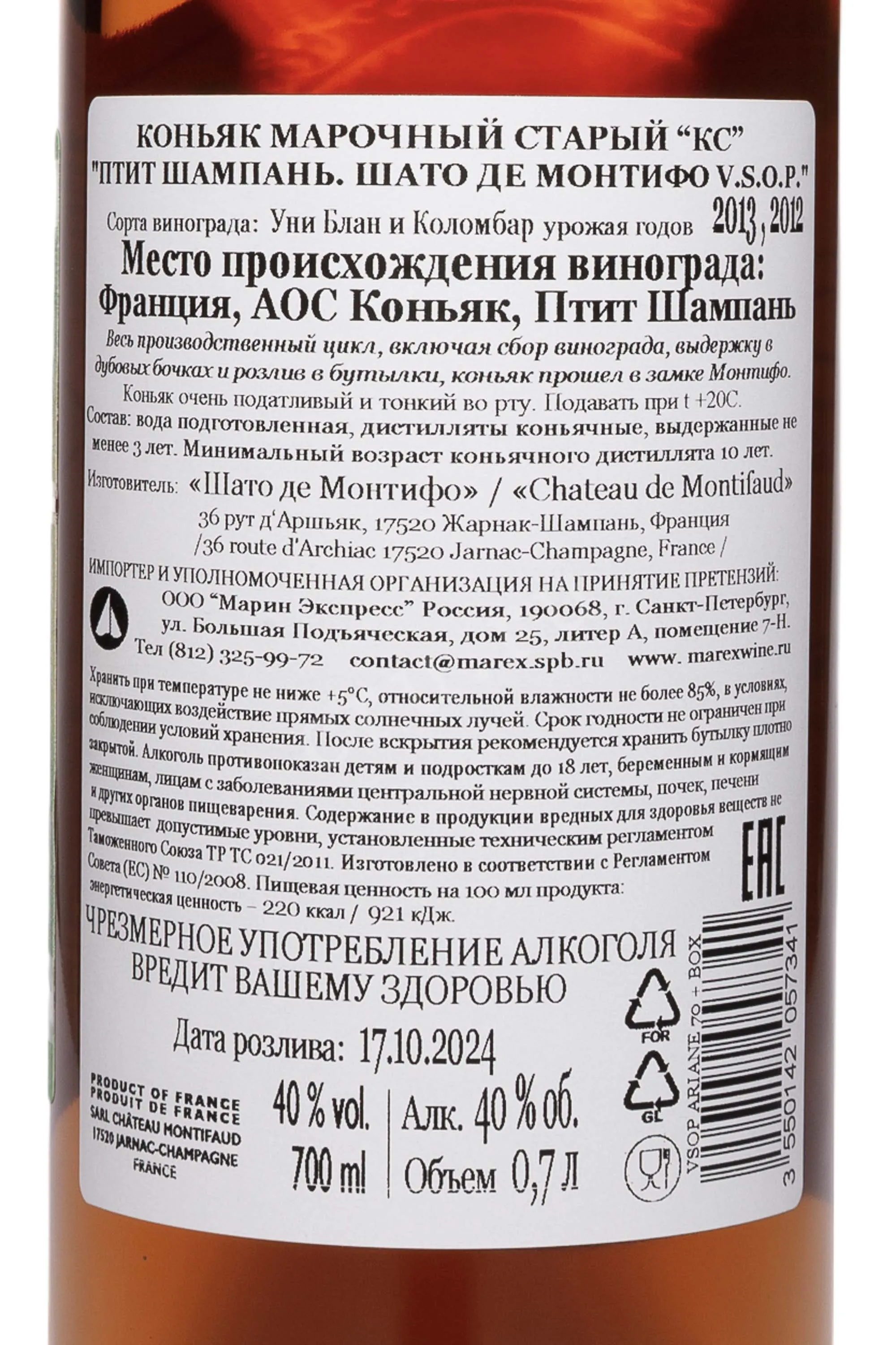 Коньяк Chateau de Montifaud VSOP Petite Champagne 0.7 л производится из лучших сортов местного винограда, произрастающих в регионе провинции Коньяк – Пти Шампань. Отборные коньячные дистилляты высочайшего качества проходят длительный этап созревания в бочонках из натурального лимузенского дуба на протяжении 10 лет, в старинных подвалах семейного замка Монтифо. Превосходный французский cognac поступает в стильной презентабельной упаковке, станет отличным подарком на любое торжественное событие.