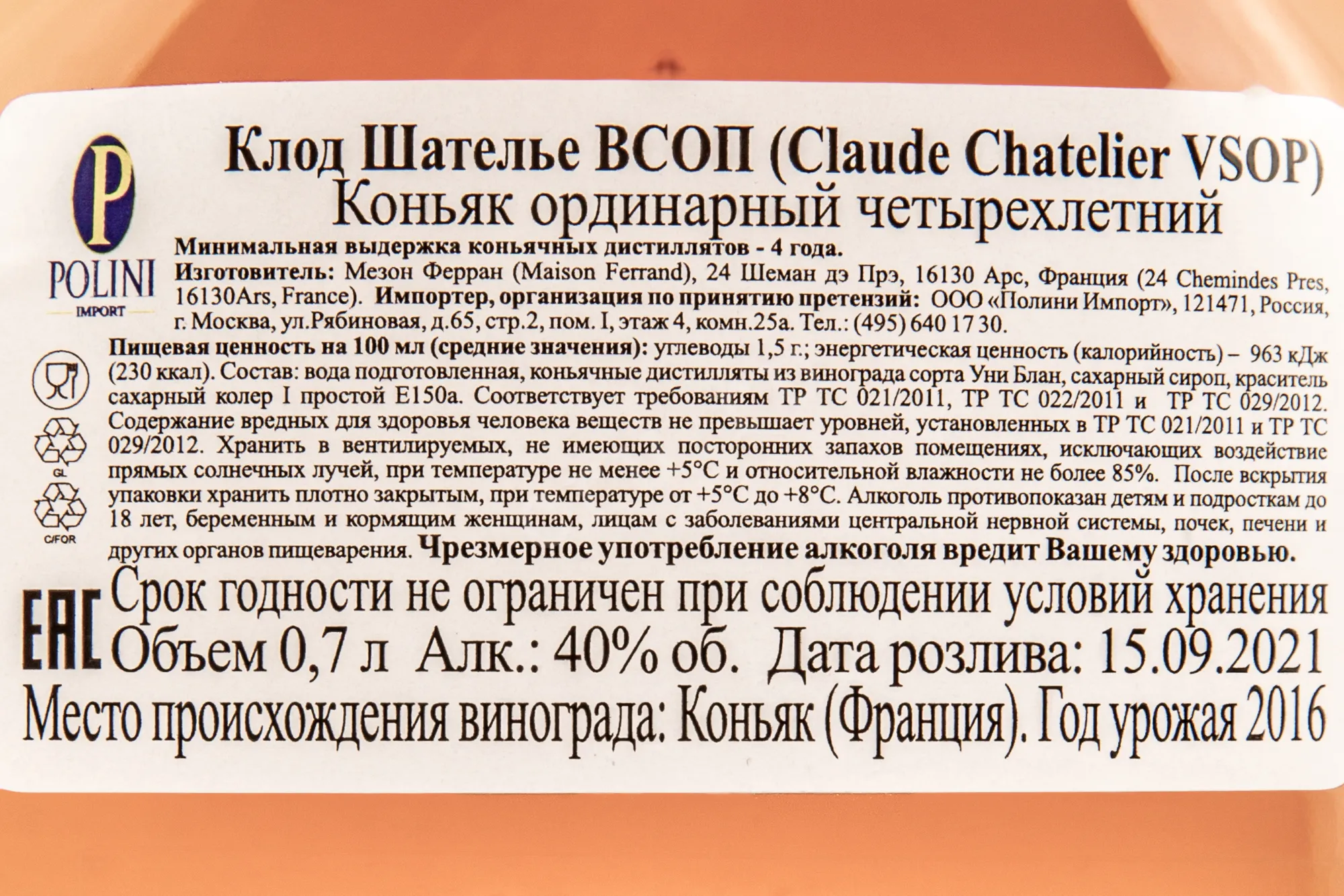Коньяк Claude Chatelier VSOP 0.7 л – изысканный французский cognac, который производится мастерами-купажистами коньячной компании Ферран из лучших сортов винограда, произрастающих в провинции Коньяк. Купаж отборных коньячных спиртов высочайшего качества выдерживается в больших 350-литровых новых бочонках из лимузенского дуба, а через год дистилляты переливаются в более старые бочки и дозревают не менее 8 лет. Продается коньяк в элегантном декантере, станет отличным подарком на любое торжественное событие.