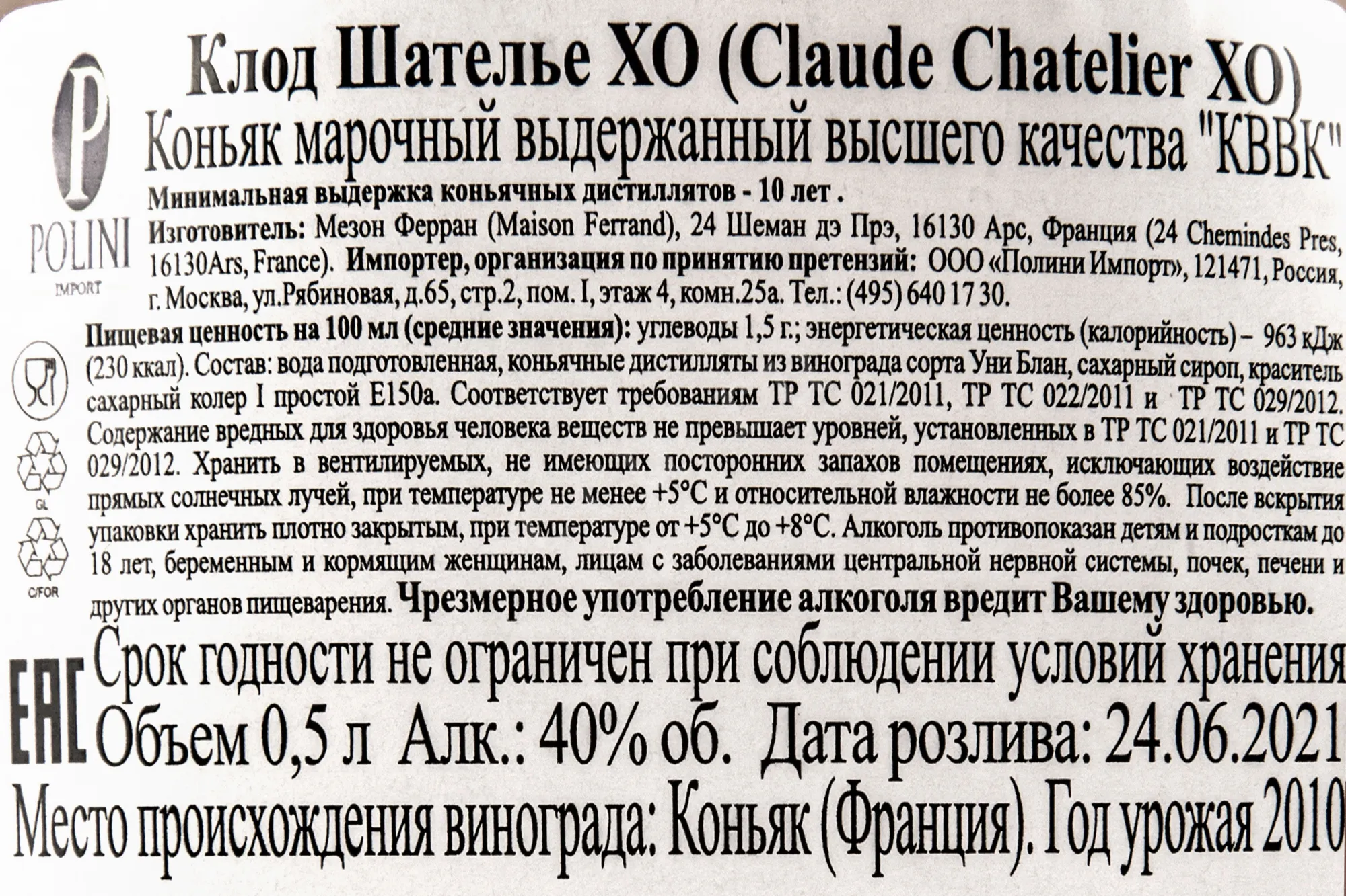 Коньяк Claude Chatelier XO 0,5 л изготавливается в соответствии со старинными традициями французской винокуренной отрасли. Сброженное из виноградного сока сусло медленно нагревают и дважды перегоняют в медных аламбиках. Отобранные спирты разливают в новые 350-литровые бочки из лимузенского дуба, обладающего высокой пористостью. После 12 месяцев выдержки дистилляты переливают в более старые емкости и оставляют дозревать. Обще время состаривания напитка составляет десять лет.