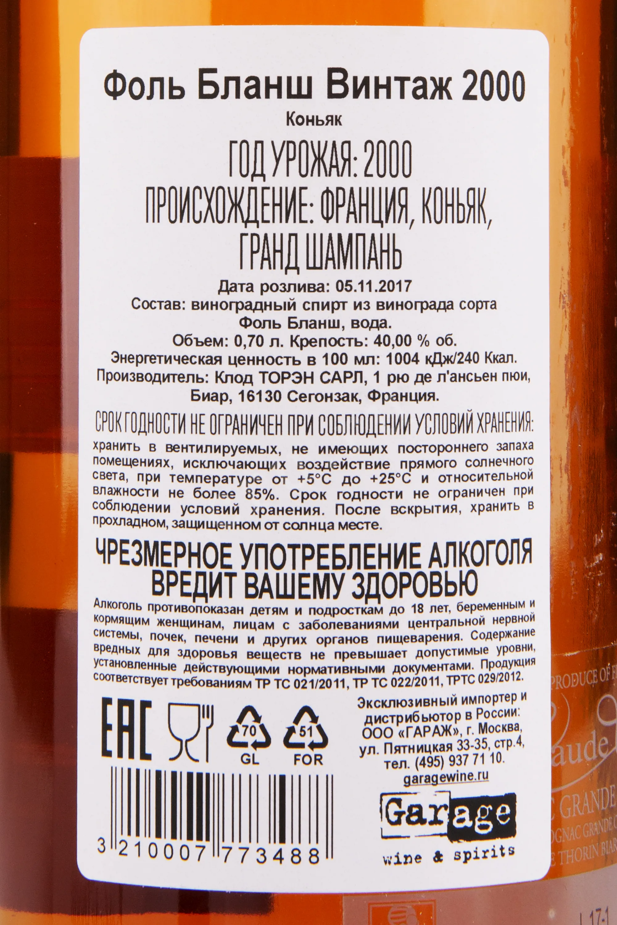 Коньяк Claude Thorin Folle Blanche Vintage in gift box 2000 г – винтажный французский cognac, производится из редкого сорта винограда, который практически полностью исчез после кризиса филлоксеры в 1880 году. Клод Торин – нынешний руководитель предприятия. Он решил сохранить этот уникальный сорт и создал настоящую гордость своей компании, с выдержкой в красных дубовых бочках не менее 19 лет. Поставляется в элегантной сувенирной упаковке, станет дорогим подарком для ценителей крепкого французского алкоголя.