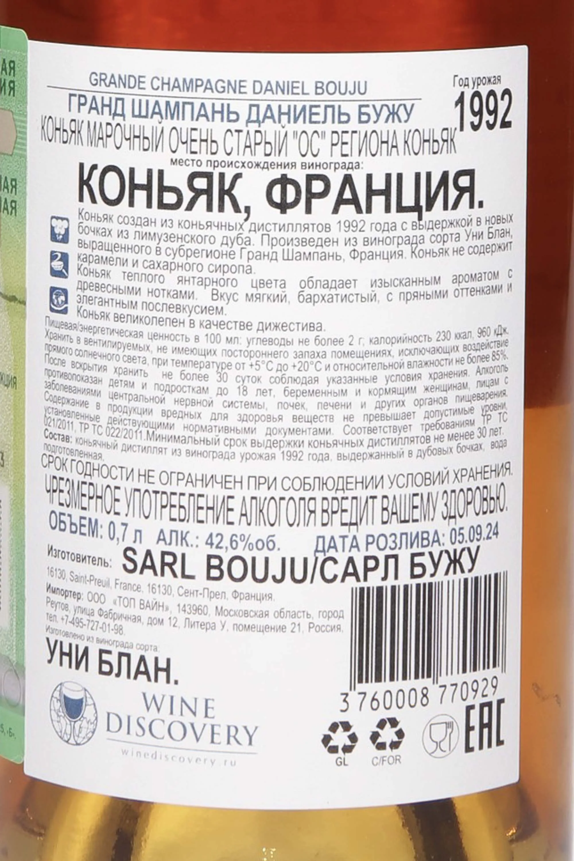 Коньяк Daneil Bouju Grande Champagne Premier Cru De Cognac 1992 года 0,7 л в подарочной упаковке — редкий винтаж, созданный из винограда, выращенного на терруаре Гран Шампань. Этот регион считается лучшим для производства коньяков высшей категории. Дистилляция проводилась традиционным методом в медных аламбиках, после чего спирты выдерживались не менее 30 лет в бочках из лимузенского дуба. Длительная выдержка придала ему сложность, гармонию и глубину вкуса. Коньяки Даниэля Бужу известны качеством, которое подтверждено сертификатом BNIC, и своим особенным, индивидуальным стилем. Винтаж 1992 года был высоко оценен критиками за насыщенность и элегантность, его отмечали в специализированных обзорах как образец терруарного коньяка с большим потенциалом.