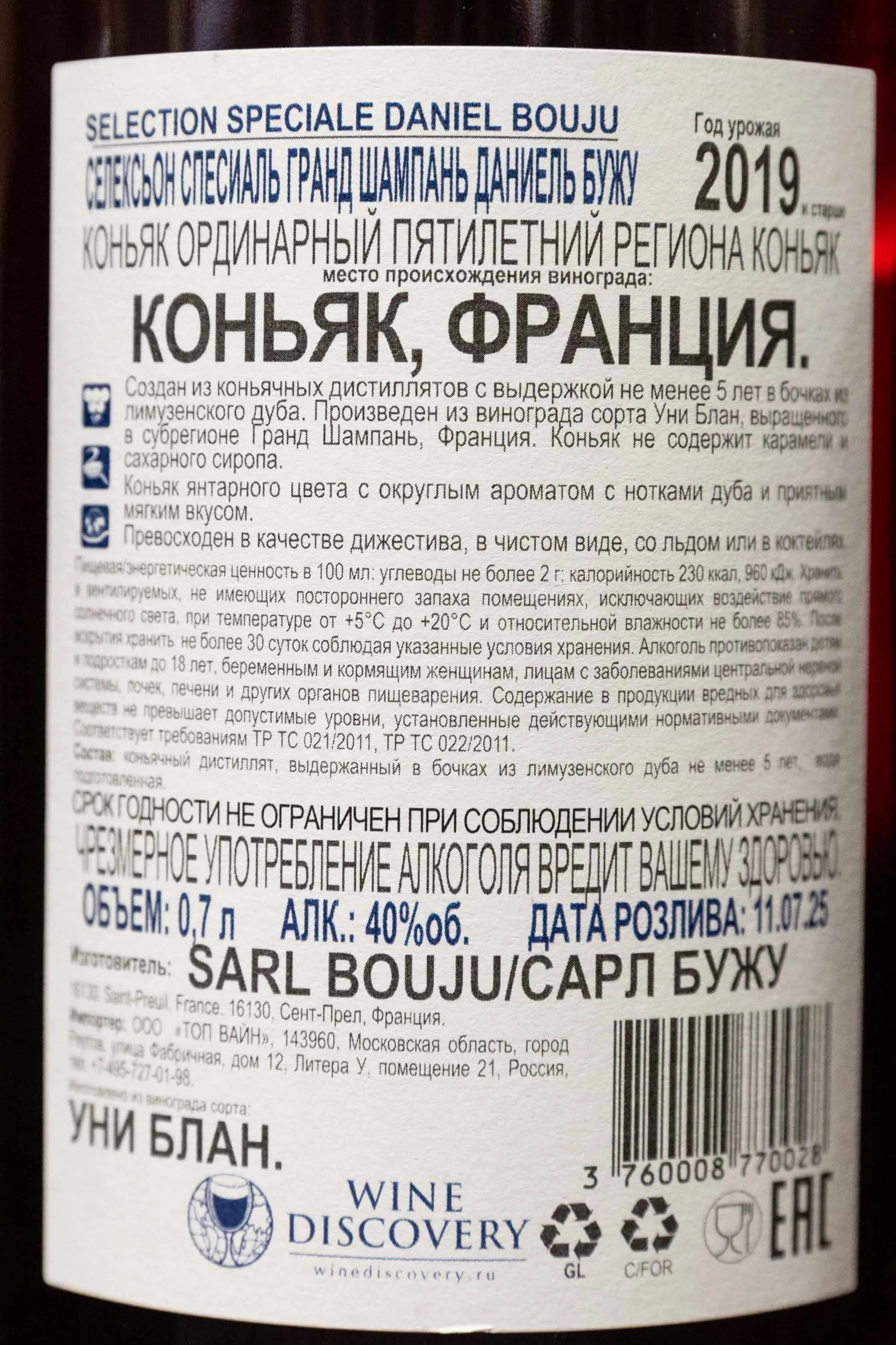 Коньяк Daniel Bouju Selection Speciale Grande Champagne 0.7 л – изысканный французский cognac, создается мастерами купажа коньячного дома Бужу из отборного винограда, выращенного в субрегионе Гран Шампань. Коньячные дистилляты отменного качества выдерживаются в лимузенских дубовых бочонках на протяжении 5 лет, в погребах предприятия. Продается в стильной презентабельной упаковке, станет достойным подарком на любое торжество.