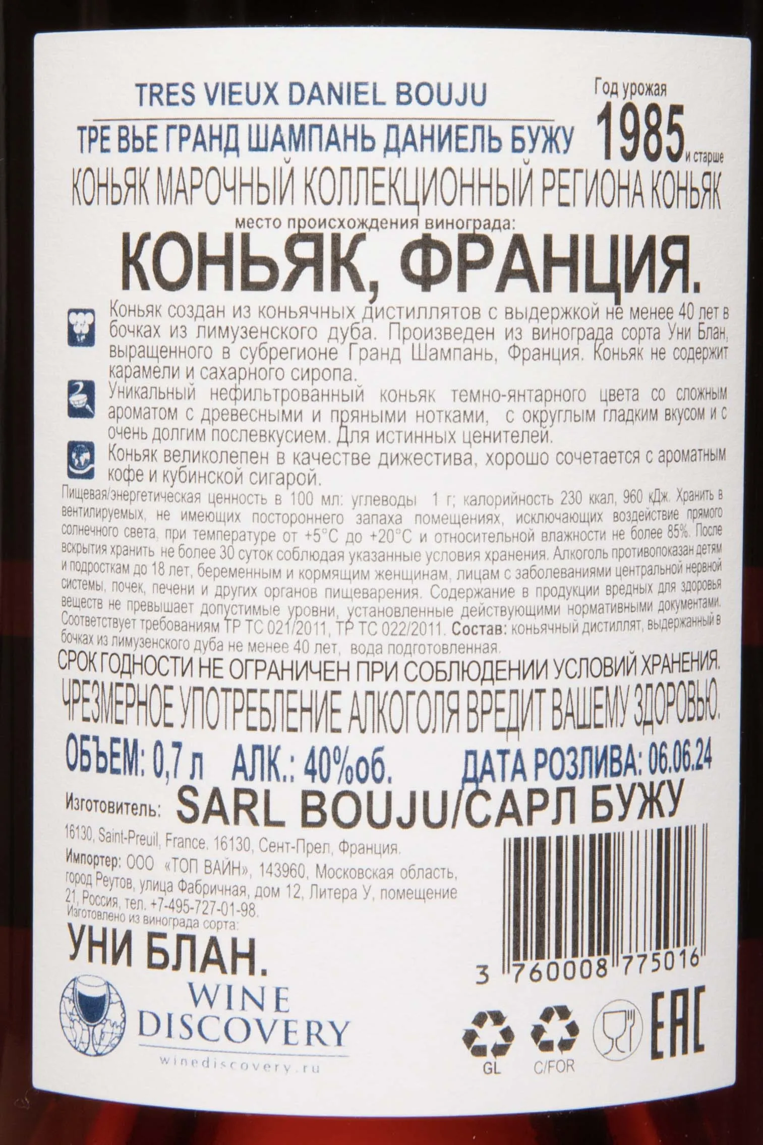 Коньяк Daniel Bouju Tres Vieux Grande Champagne 0.7 л – изысканный французский cognac, который создается купажистами коньячного дома Бужу. Производится из винограда, выращенного в лучшем регионе провинции Коньяк – Гран Шампань. Купаж отборных коньячных спиртов проходит длительный процесс выдержки в лимузенских дубовых бочонках на протяжении 40 лет, в собственных погребах компании. Продается в бутылках с сургучной печатью и упакован в презентабельную деревянную коробку, станет превосходным подарком для коллекционера, на 40-летний юбилей или на любой другой торжественный случай.