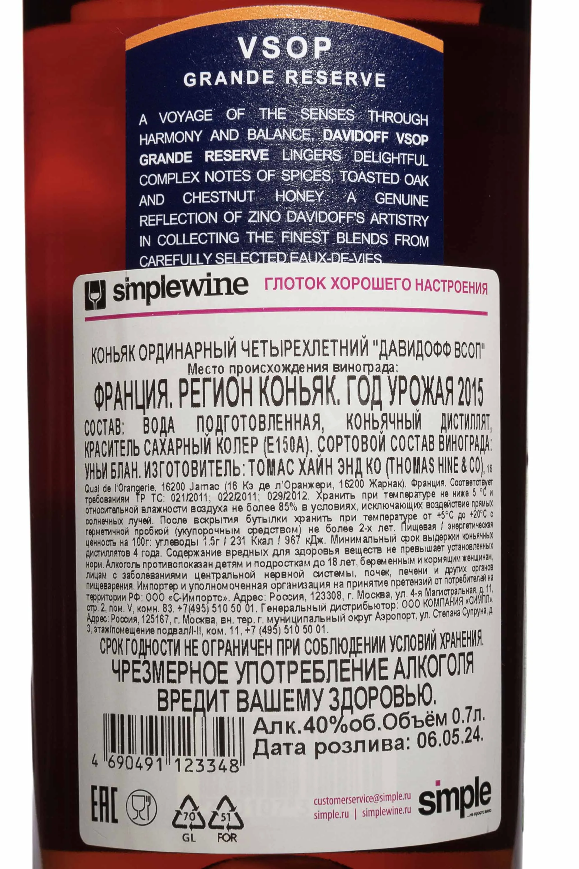 Коньяк Davidoff VSOP 0.7 л – изысканный французский cognac, изготавливается из лучших сортов винограда высочайшего качества. Производится путем двойной дистилляции отборных коньячных спиртов по методу Шаранта. Выдержка проходит в бочках из французского дуба в течение 10 лет. Поставляется напиток в элегантной сувенирной упаковке, станет прекрасным презентом на все случаи жизни.
