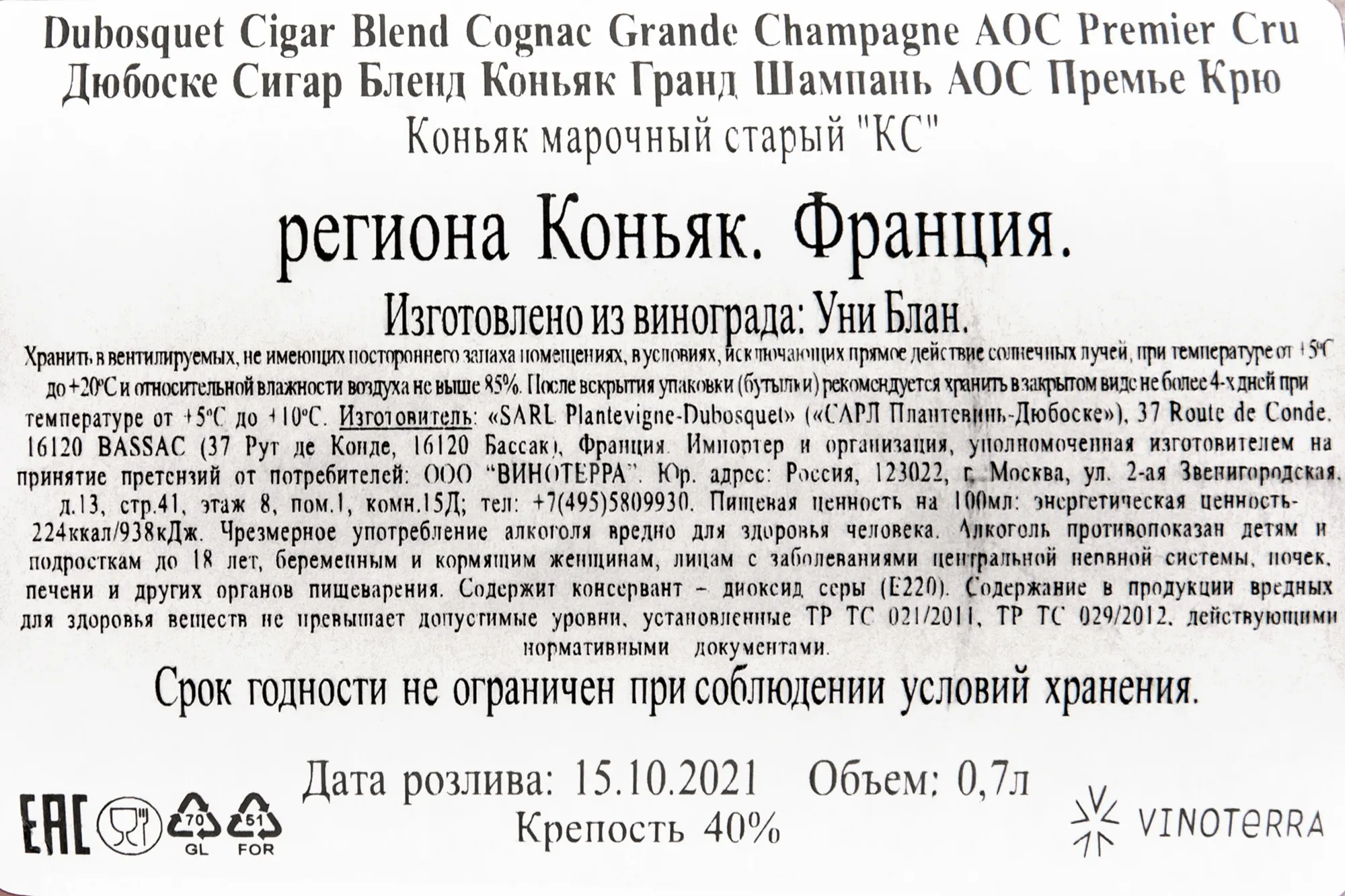 - Сорт винограда: Уни Блан 100%.