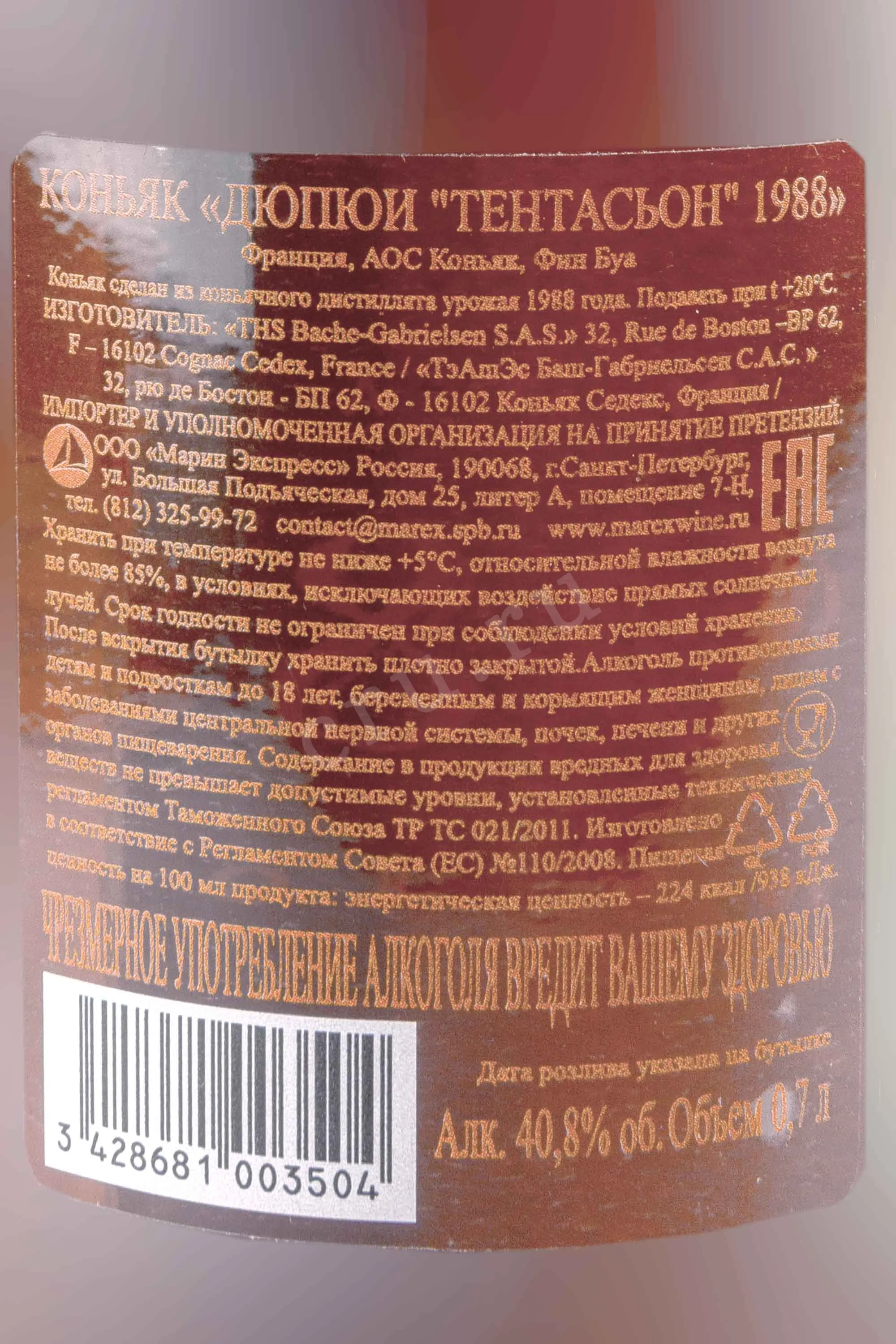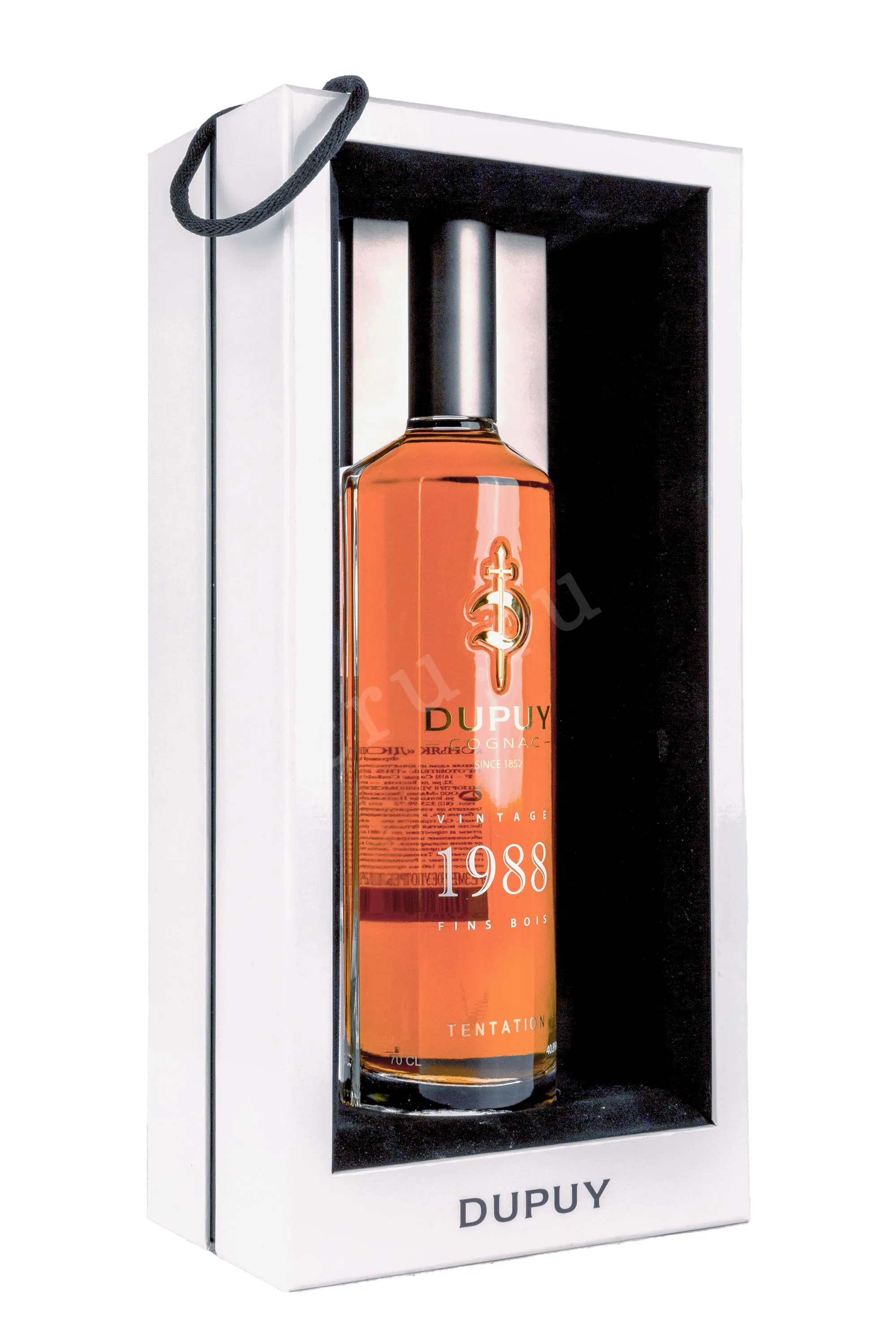 Коньяк Dupuy Tentation 1988 г 0.7 л – винтажный французский cognac, который изготавливается мастерами купажа коньячного дома Баш–Габриэльсен из отборных сортов винограда урожая 1988 года. Высококачественные коньячные спирты из регионов Гран Шампань, Фэн Буа и Пти Шампань выдерживаются долгое время в бочонках из лимузенского дуба, в специальных погребах предприятия. Изысканный коньяк продается в роскошной сувенирной упаковке, станет замечательным подарком для коллекционера и людей 1988 года рождения.