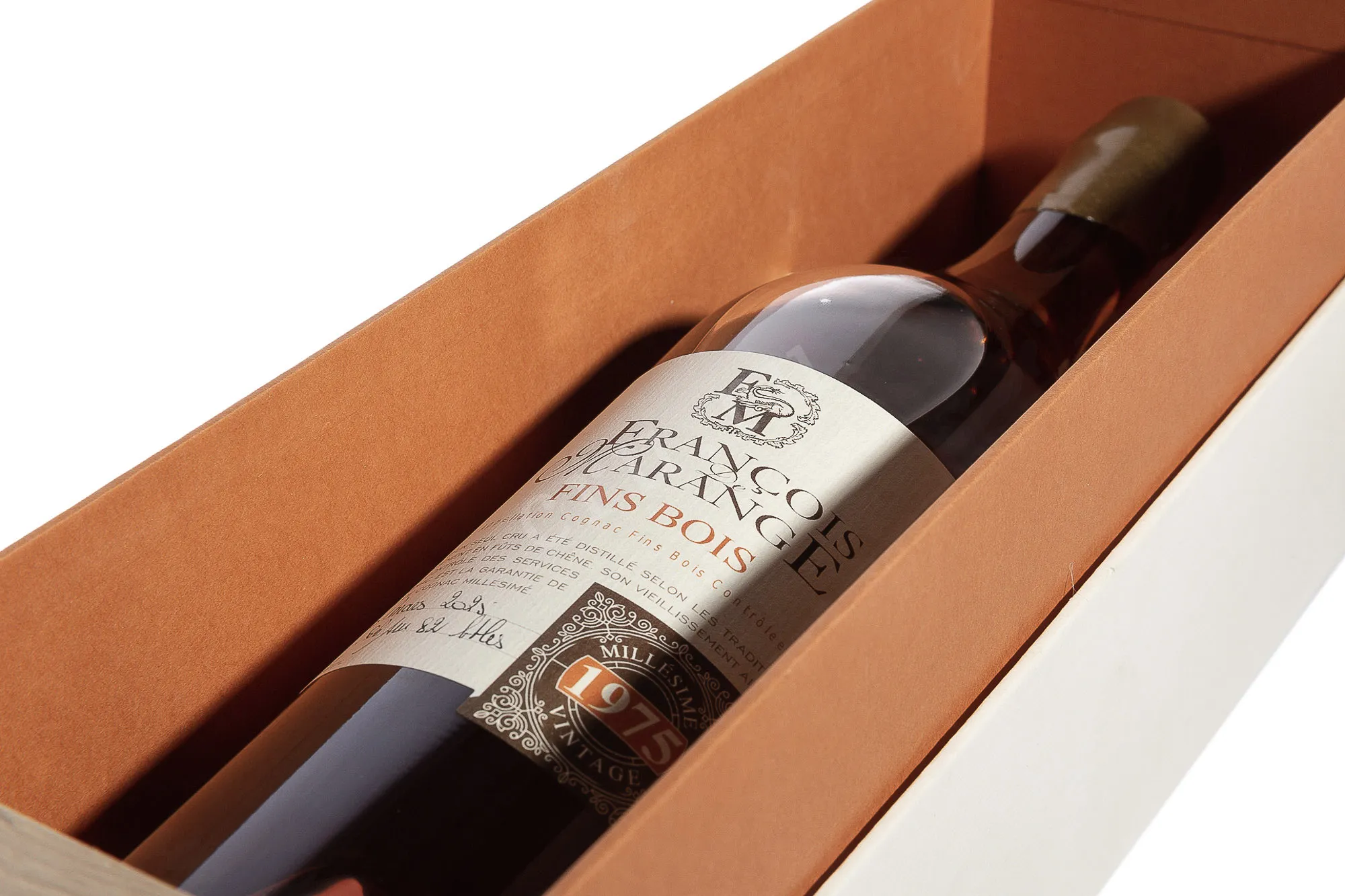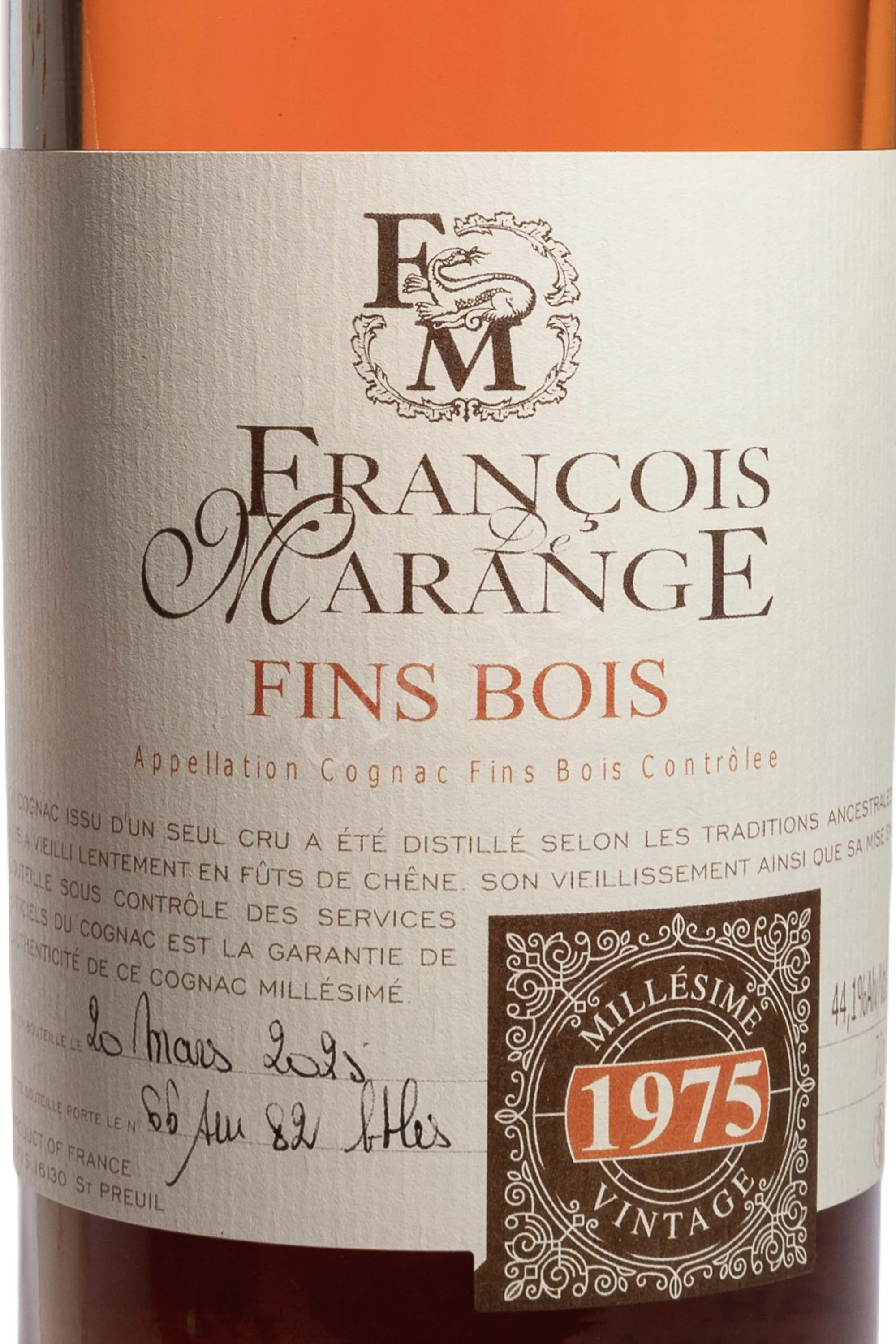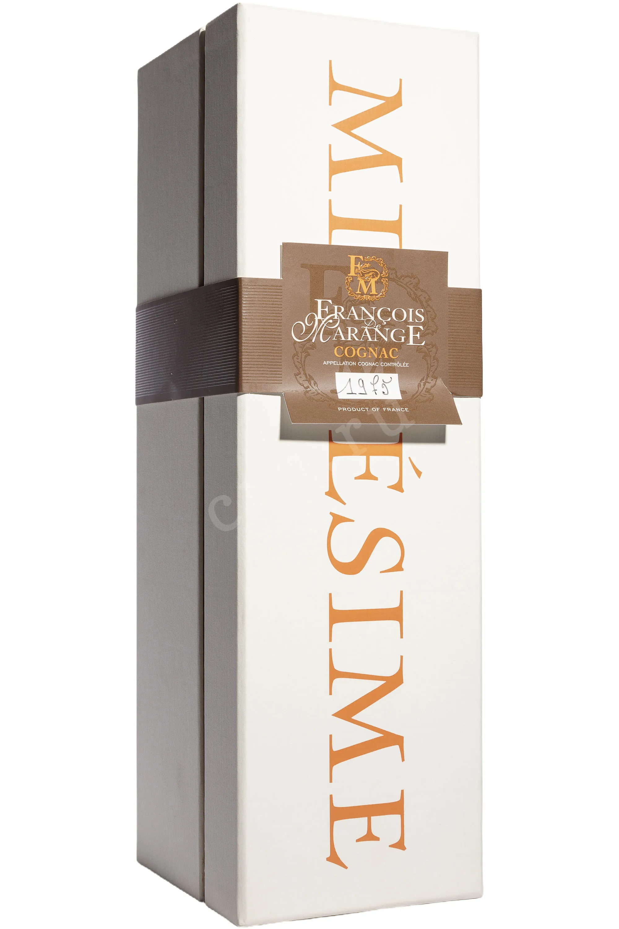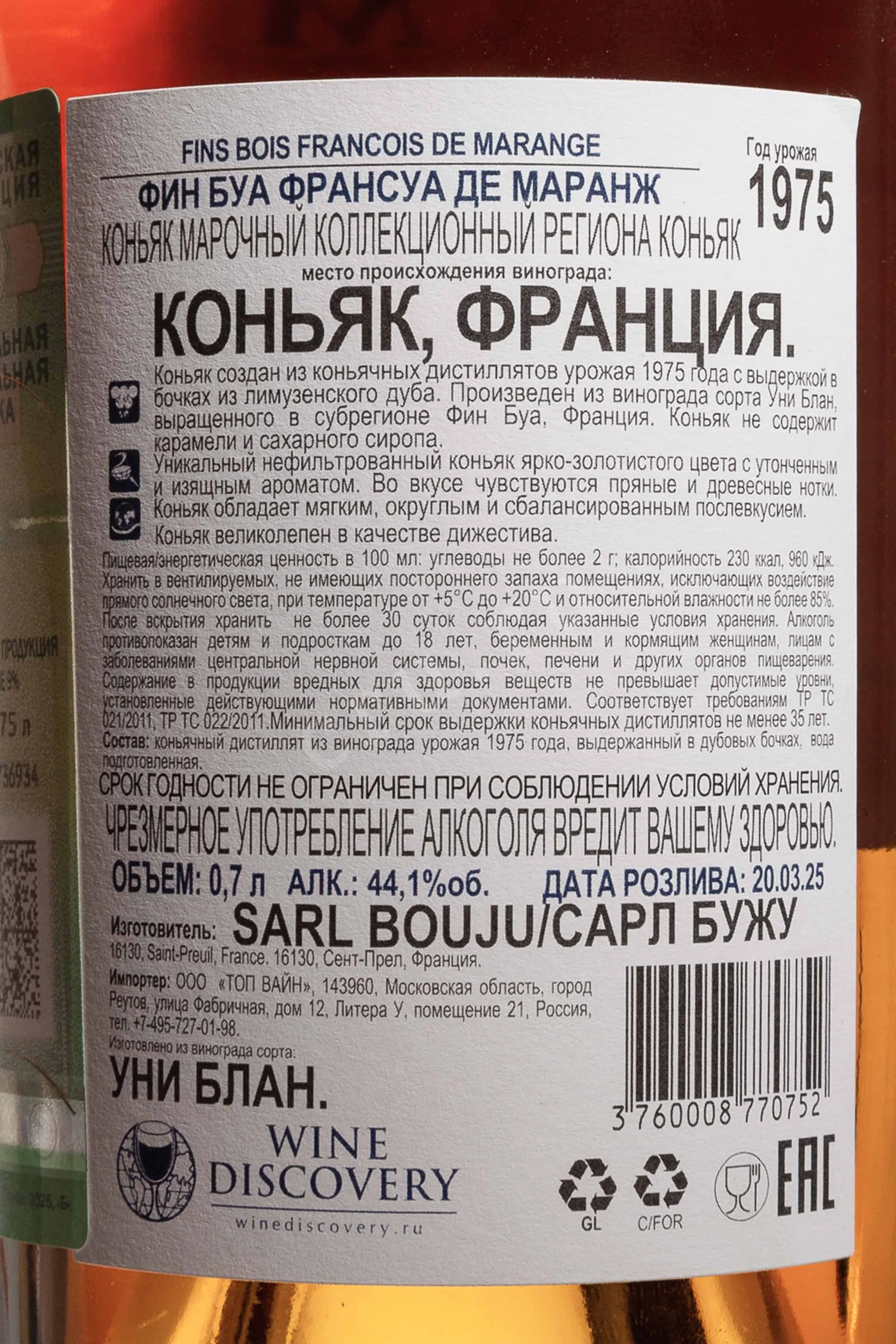 Коньяк Francois de Marange 1975 0.7 л – винтажный французский cognac, который был создан из лучших сортов винограда урожая 1975 года, собранного в регионе провинции Коньяк – Фэн Буа. Купаж отборных коньячных спиртов высочайшего качества проходит двойную дистилляцию по классическому методу Шаранта в 16-гектолитровых медных котлах, после чего выдерживаются в бочонках из лимузенского дуба на протяжении долгих 33 лет, в старинных погребах коньячного дома Даниэль Бужу. Был выпущен в 2008 году в ограниченном количестве – всего 82 бутылки, с индивидуальным номером на этикетках. Эксклюзивный коньяк продается в сувенирной деревянной коробке, станет роскошным подарком для коллекционера, ценителя и людей 1975 года рождения.