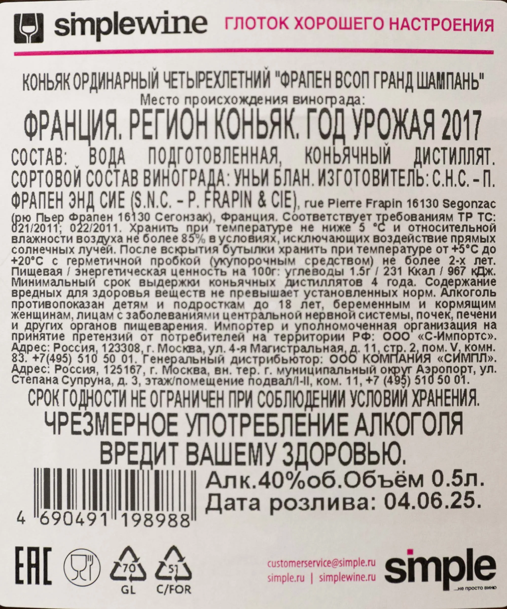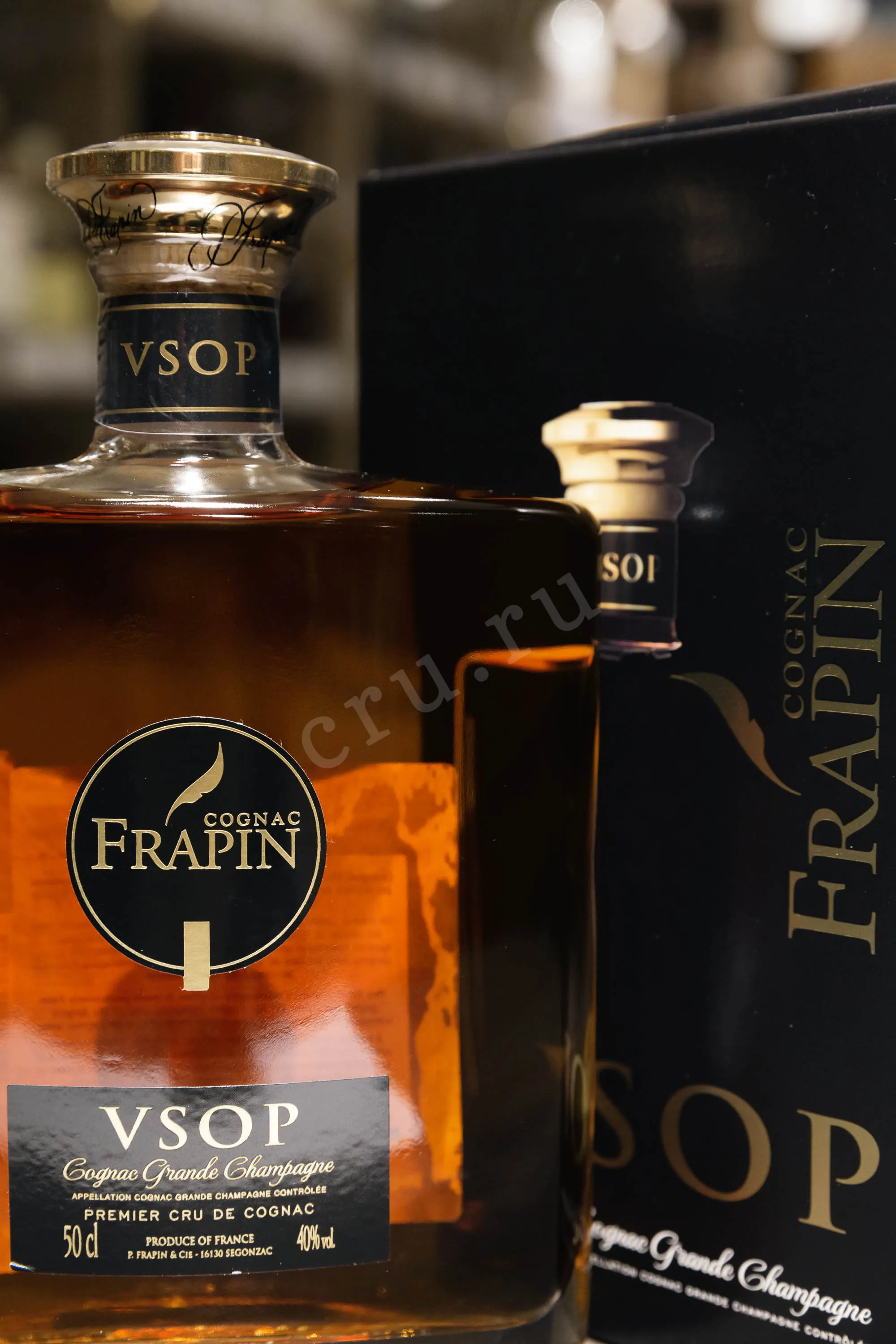 Коньяк Frapin VSOP Grande Champagne 0,5 л продается в стильном прямоугольном графине, укомплектованном подарочным черным боксом с его изображением. Все стадии изготовления премиального сорокапроцентного напитка прошли во Франции, регионе Коньяк. Его основой стал спелый белый виноград ручного сбора, выращенный на территории местности Гран Шампань и обработанный путем ферментации и двойной перегонки. Выдержка дистиллятов средним сроком 12 лет осуществилась в лимузенских дубовых бочонках.