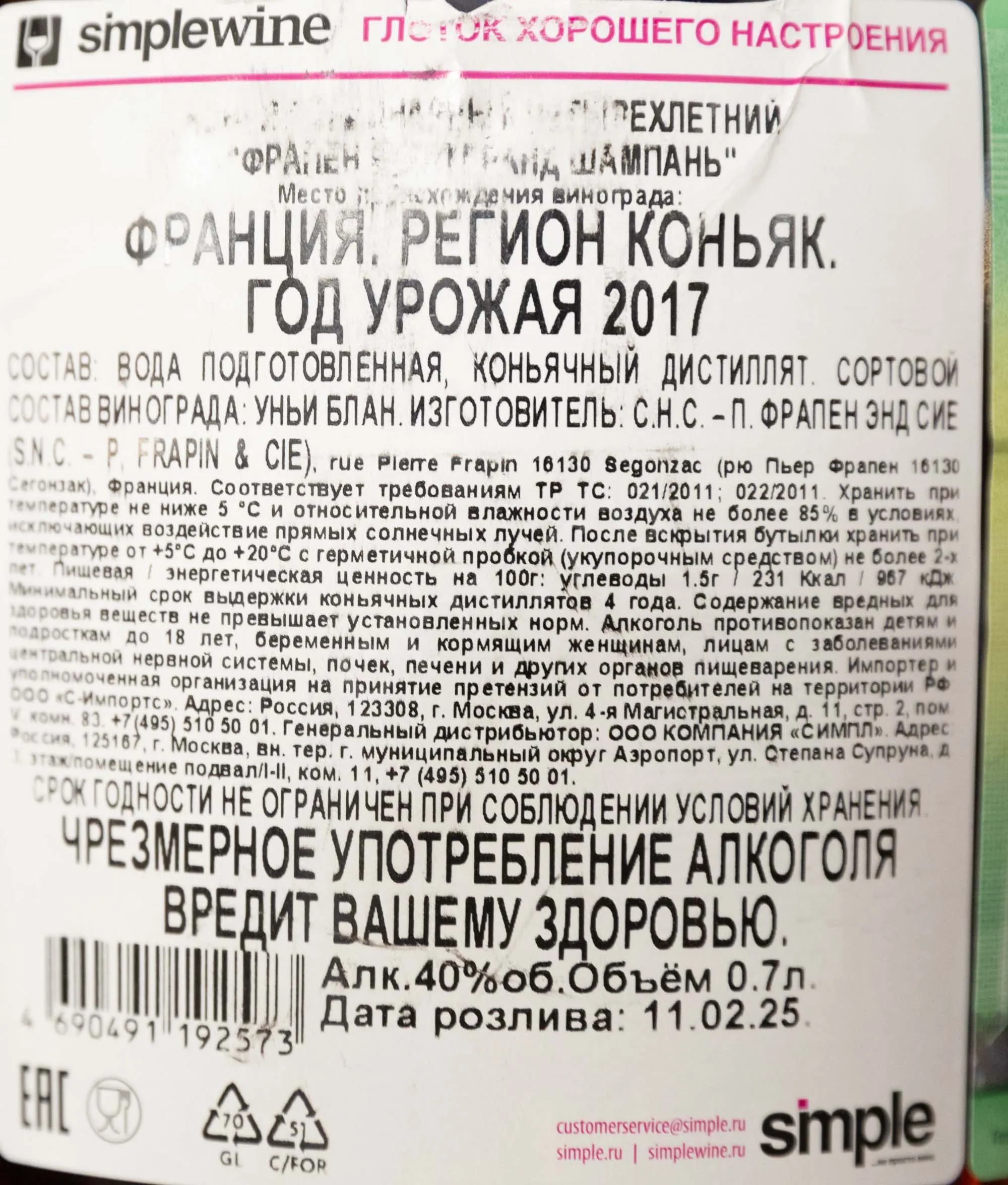 Коньяк Frapin VSOP 0.7 л создан из спиртов региона Гранд Шампань, который считается одним из лучших терруаров Коньяка. Напиток выдержан в классическом стиле дома Фрапин. Виноград выращивают на меловых почвах вокруг исторического поместья семьи, применяя органические методы. Урожай быстро перерабатывают с помощью пневматических прессов, чтобы сохранить чистоту сока. После ферментации получают сухое вино крепостью около 7-9%, его не фильтруют для сохранения аромата. Дистилляция проходит традиционным способом. Выдержка протекает в бочках из лимузенского дуба. Часть спиртов сначала помещают в новые бочки для набора танинов, затем переливают в старые. Созревание идет как во влажных погребах, так и в сухих чердачных помещениях, что формирует более насыщенный характер. Коньяк регулярно получает высокие оценки на международных конкурсах и ценится за баланс и чистоту стиля.