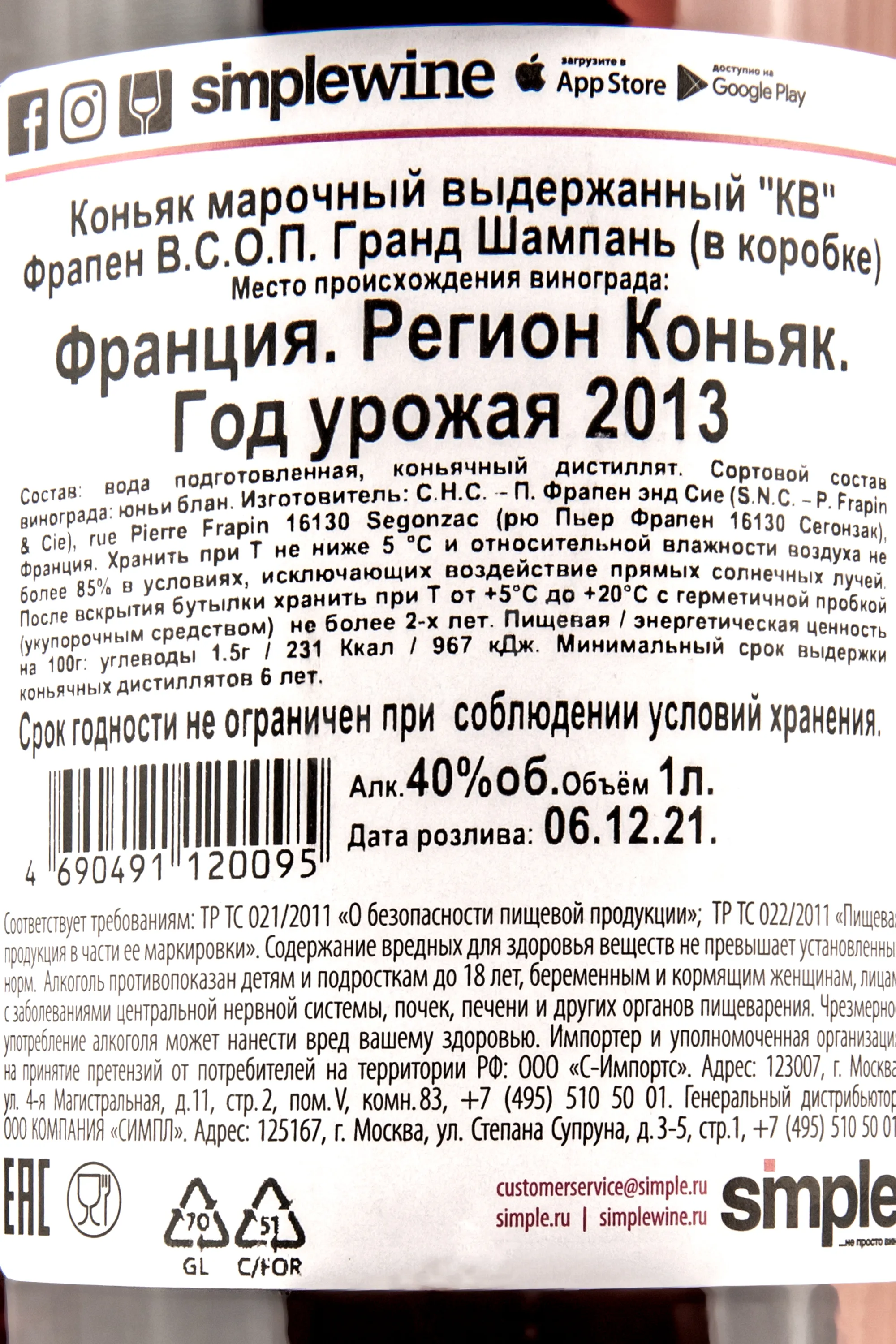 Коньяк Frapin VSOP in gift box Grande Champagne 1 л представляет собой бленд тщательно отобранных спиртов французского винограда, собранного ручным способом на территории местности Гран Шампань в регионе Коньяк. Ягоды с участков, классифицируемых как органические, подверглись сбраживанию и двойной перегонке. Срок выдержки в дубе составил не менее 6 лет. Напиток с традиционным уровнем содержания алкоголя (40%) предлагается в вытянутой стеклянной бутылке литрового формата, сопровождаемой черной глянцевой подарочной коробкой.