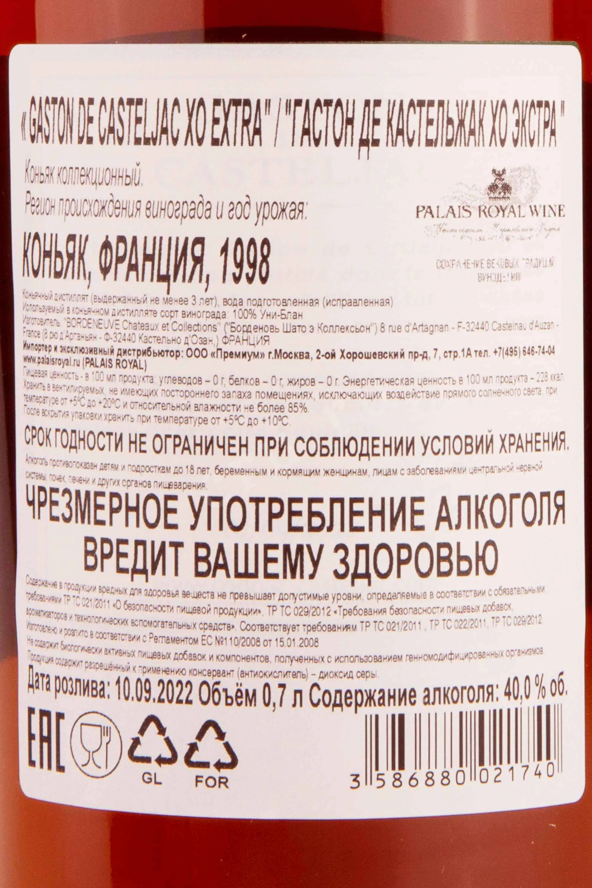 Коньяк Gaston de Casteljac XO Extra 0,7 л в п/у представлен купажом из зрелых виноградных дистиллятов, выдержанных во французском дубе на протяжении разного времени. Этап состаривания в контакте с древесиной придал спиртам выразительный и сложный вкусоароматический профиль. Бленд разлили в бутылку из прозрачного стекла. В паре с деревянным ящичком это превосходный сувенир для коллекционеров и ценителей.