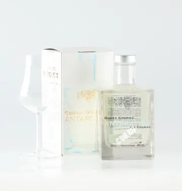Коньяк Godet Antarctica 0,5 л реализуется в прямоугольной стильной бутылке, укомплектованной подарочным боксом в светлых тонах. Кроме того, сувенирный набор содержит стопки для дегустации в количестве шести штук. Выпуск сорокаградусного алкогольного напитка необычного прозрачного оттенка, сформированного благодаря применению двухэтапной фильтрации, был посвящен экспедиции главы французской компании-изготовителя Жан-Жака Годе к берегам Антарктиды в 2008 году. Также спиртное подверглось дистилляции и вызреванию в очень старых бочках (возраст порядка 100 лет) сроком от семи лет.