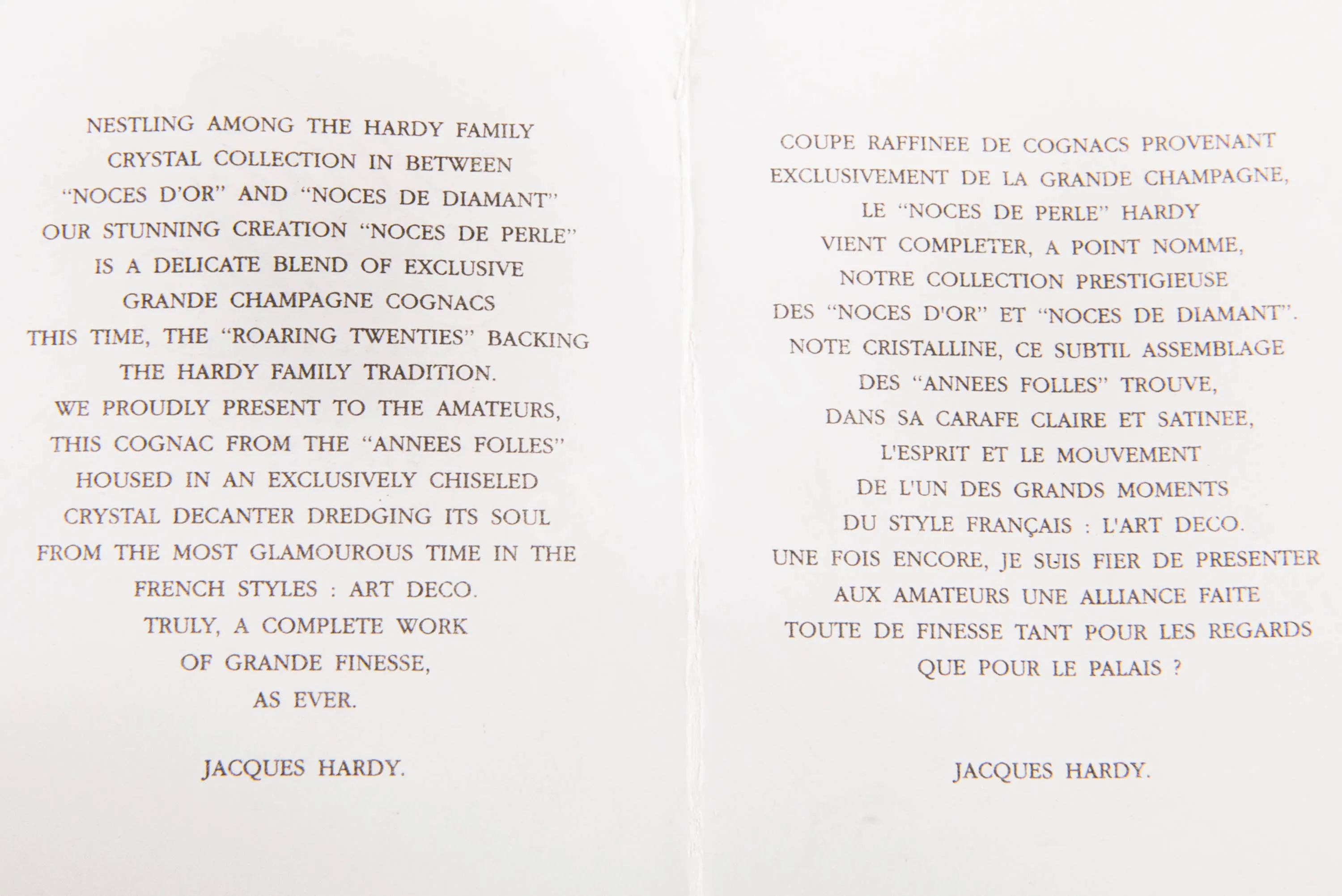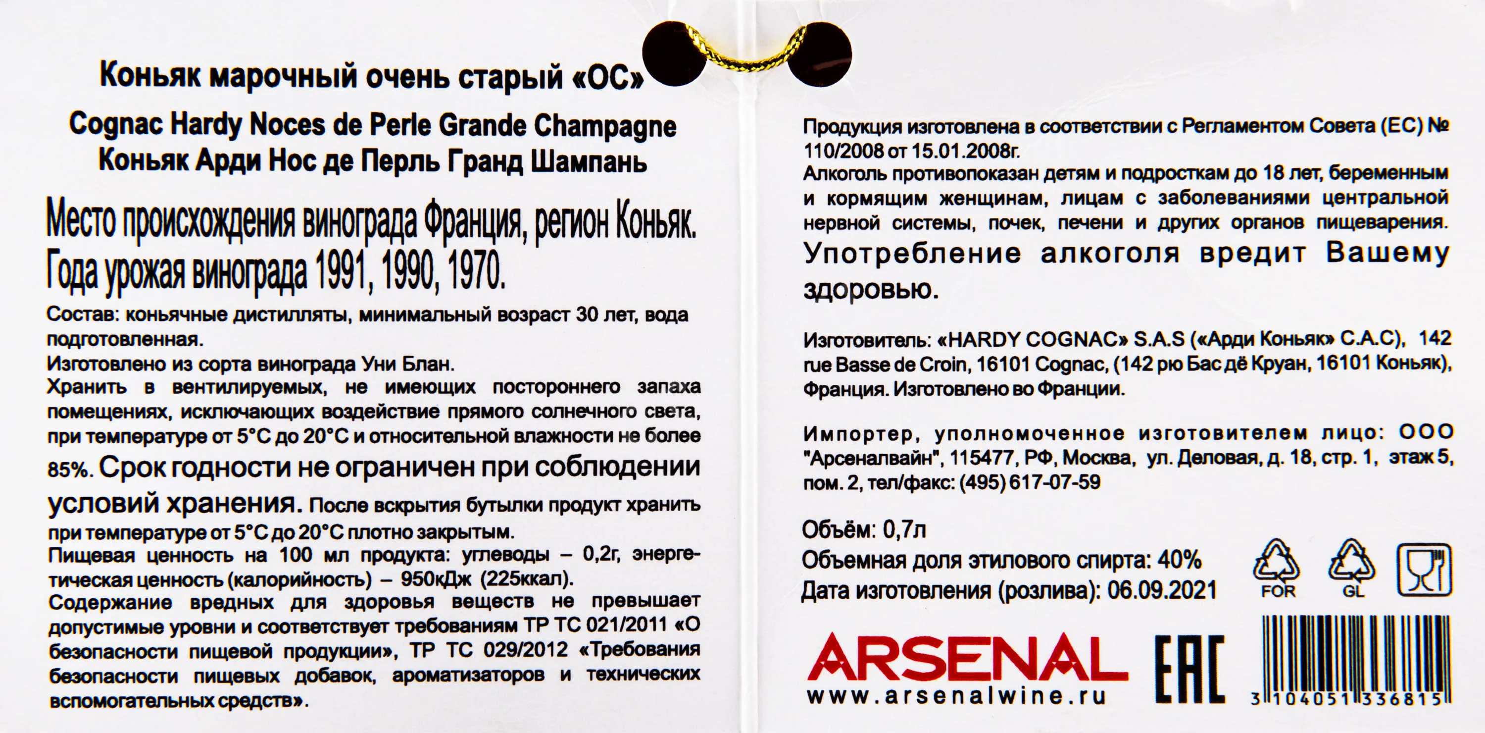 Коньяк Hardy Noces de Perle Grande Champagne gift box 0.7 l – это роскошный французский напиток крепостью 40%, созданный из винограда урожая 1970, 1990 и 1991 годов. В купаж входят 10 коньячных спиртов, выдержанных в слегка обожженных изнутри барриках из лимузенского дуба в течение 30 лет. Готовый коньяк из Гран Шампани представлен в стильных дизайнерских графинах Lalique в паре со статусным подарочным боксом.