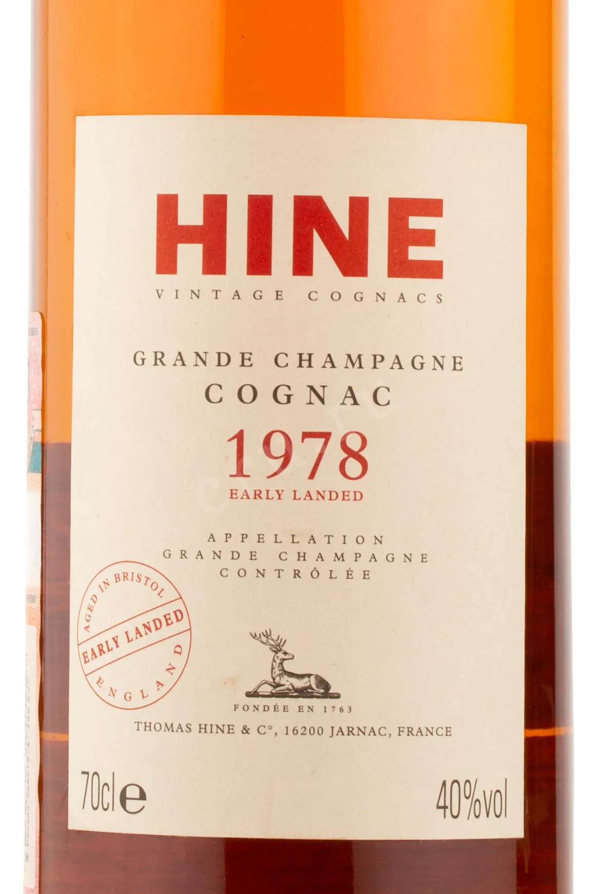 Коньяк Hine 1978 г Champagne 0.7 л — винтажный французский cognac, который был создан лучшими мастерами-купажистами известного коньячного дома Хайн из высококачественного винограда урожая 1978 года, собранного в субрегионе Гран Шампань. Ассамбляж отборных коньячных дистиллятов выдерживается в специальных новых и старых бочонках из лимузенского дуба на протяжении 35 лет, в уникальных погребах с идеально подобранными климатическими условиями. Коньяк продается в стильной деревянной коробке, станет незабываемым презентом для коллекционера выдержанного французского алкоголя и людей 1978 года рождения.