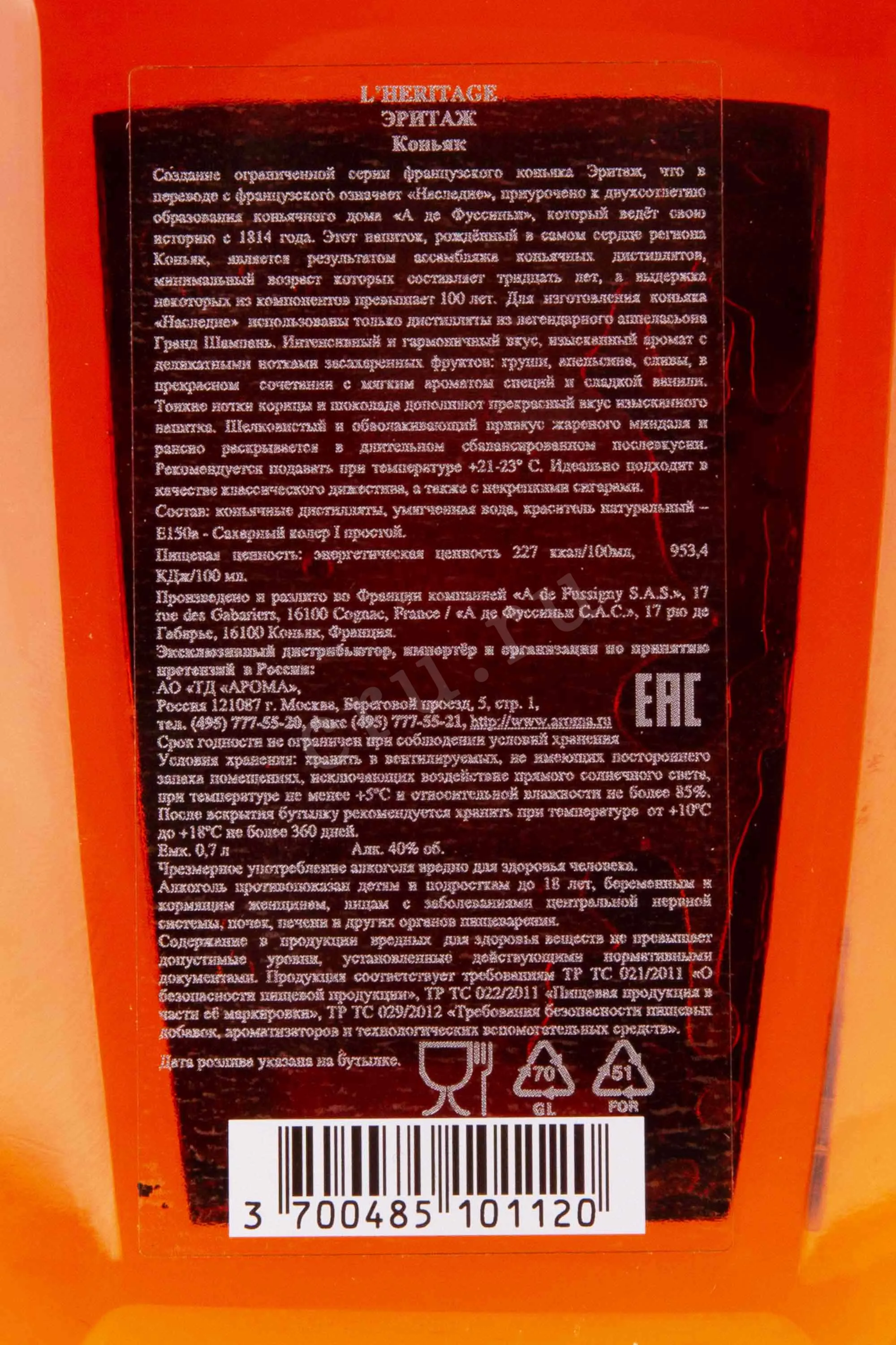 Коньяк L`Heritage de A de Fussigny 0.7 л – изысканный французский cognac супер-премиум класса, который был специально создан к 200-летнему юбилею знаменитого коньячного дома А де Фуссиньи. Название напитка переводится с французского как «наследие». Производится из отборного винограда, выращенного в лучшем регионе провинции Коньяк – Гран Шампань. Купаж высококачественных коньячных спиртов проходит длительный процесс выдержки в особых дубовых бочонках из натурального Лимузена на протяжении долгих 30-100, в погребах производителя. Лимитированный коньяк был выпущен в 2014 году, в изящном хрустальном графине и невероятно роскошной сувенирной коробке, станет непревзойденным подарком для коллекционера и ценителя эксклюзивного французского алкоголя.
