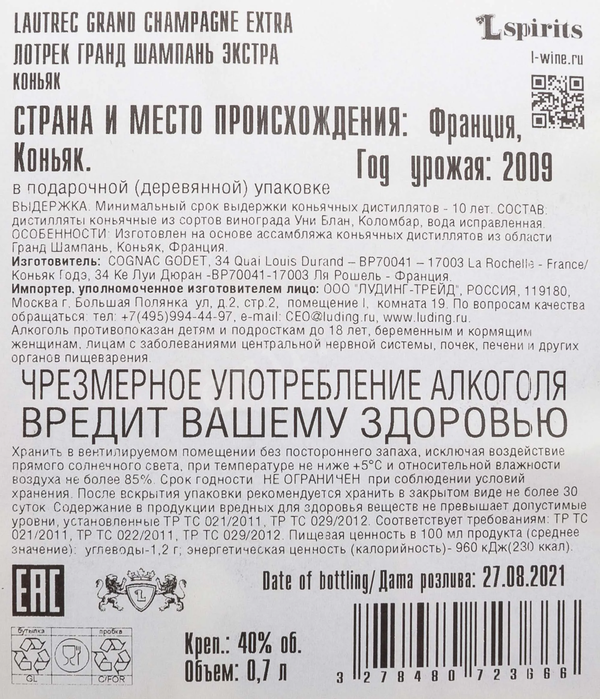 Коньяк Lautrec Extra wooden box 0.7 l – это премиальный французский алкоголь крепостью 40%, представленный в презентабельном боксе из натурального дерева. Напиток создается из винограда урожая 2009 года с помощью двойной перегонки сусла. Выдержка спиртов протекает в бочках из лимузенского дуба от 10 до 45 лет.