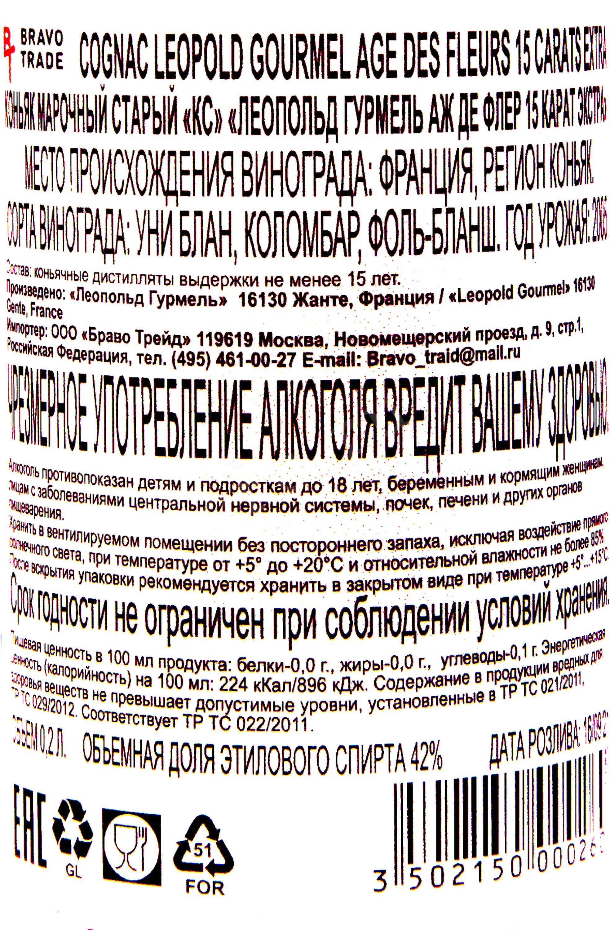 Коньяк Leopold Gourmel Age Des Fleurs 15 Carats Extra 0,2 л – вариация с великолепным балансом и яркой органолептикой. Напиток представляет собой купаж из спиртов, созданных на основе трех французских сортов винограда. Сначала из ягод сделали сухое вино, которое после перегнали в шарантском кубе. На протяжении пятнадцати лет дистилляты созревали в дубовых емкостях. Перед бутилированием партии спиртного смешали и разбавили водой до крепости 42 градуса.