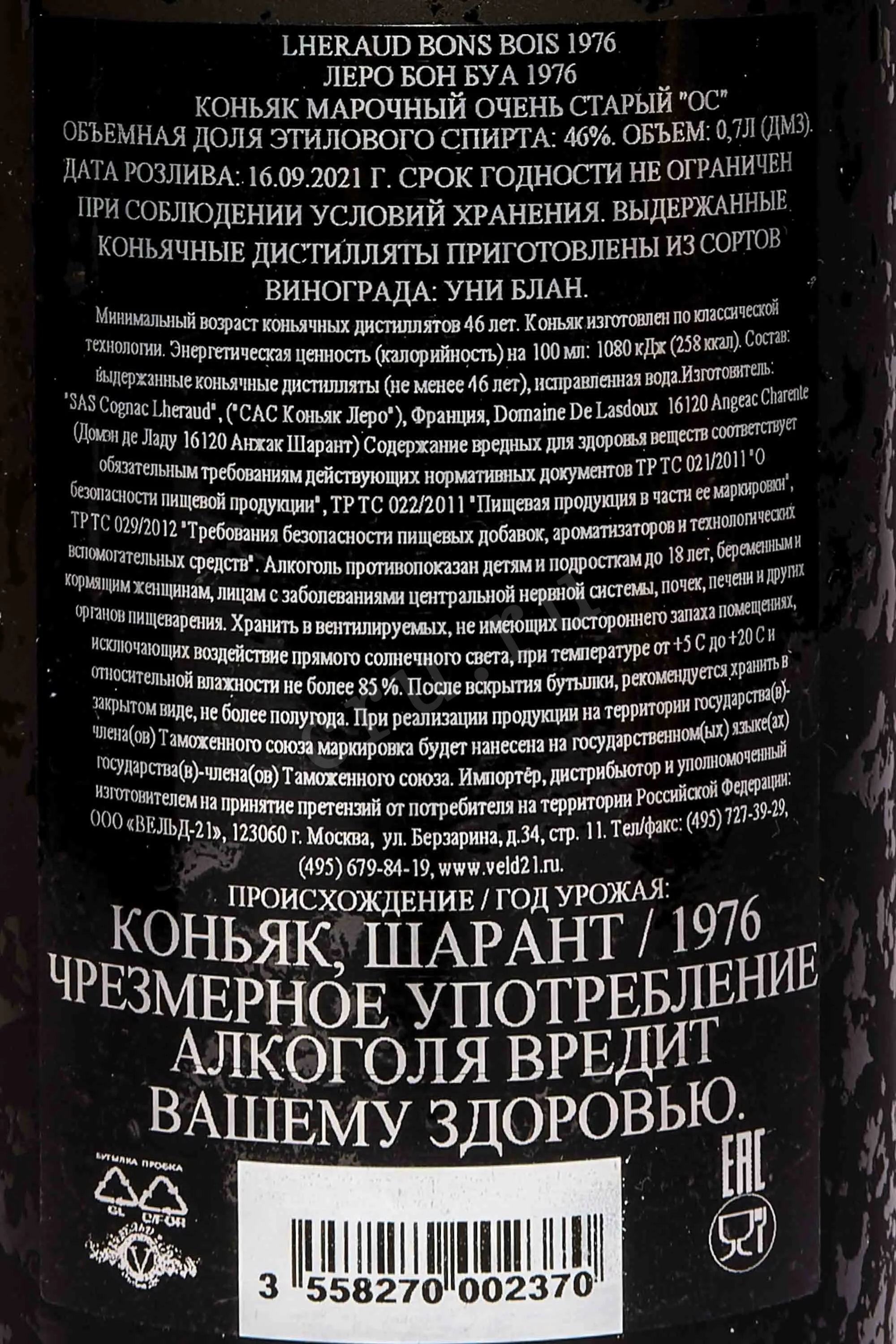 Коньяк Lheraud 1976 г. Fins Bois 0,7 л станет идеальным подарком для человека аналогичного года рождения, так как напиток отличается высочайшим качеством и красивым визуальным оформлением. Его изготовление прошло на традиционном оборудовании путем обработки спелого винограда апелласьона Фин Буа (регион Cognac, Франция): ягоды одного сезона урожая прошли сбраживание и двойную дистилляцию в шарантских аламбиках, а также долгую выдержку (порядка 35 лет) в бочках из цельной древесины лимузенского дуба. 700-миллилитровая винтажная бутылка с коньяком повышенного градуса (46%) предлагается в паре с фирменной черной подарочной коробкой, которая устлана соломой внутри.