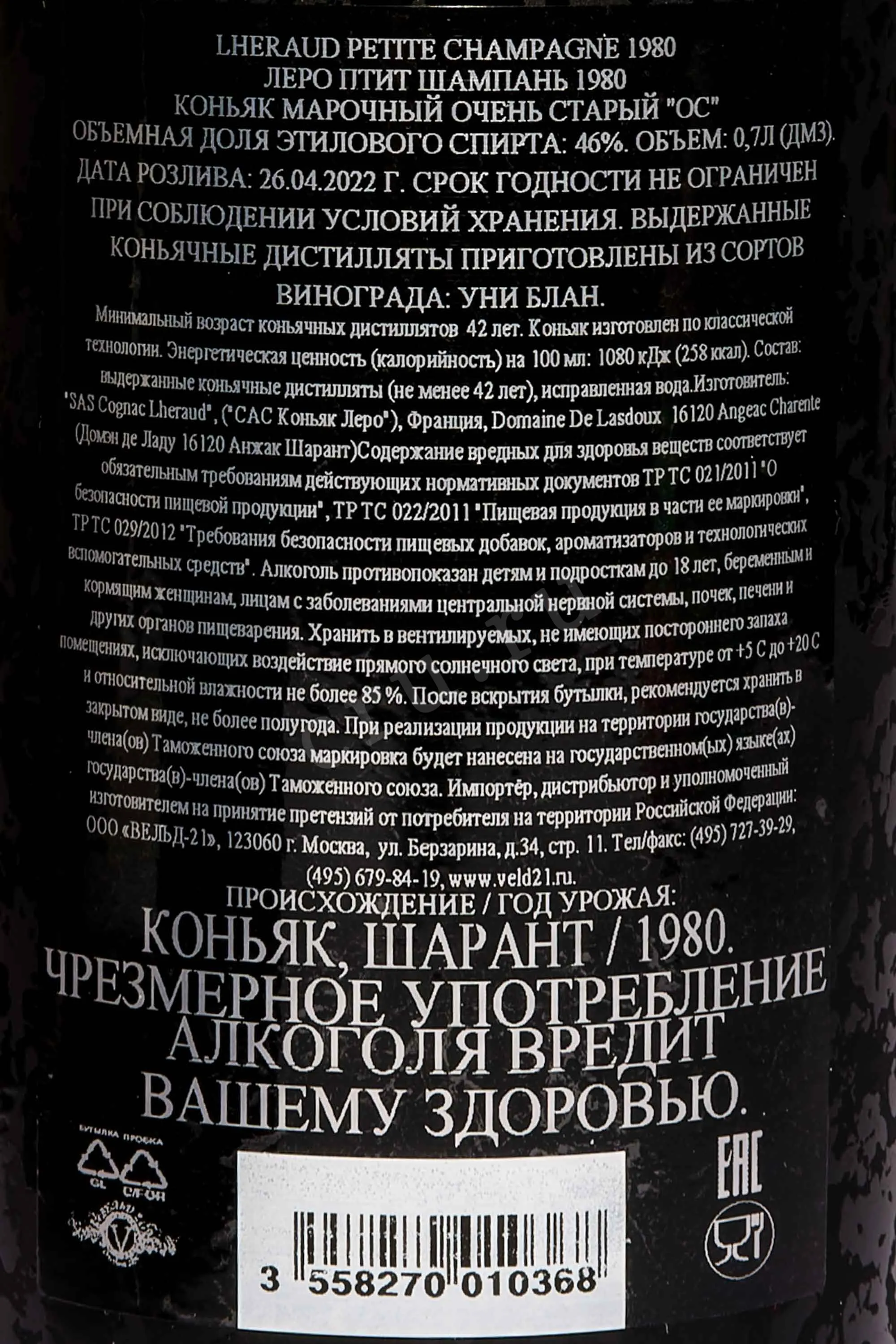 Коньяк Lheraud 1980 г. Petite Champagne 0,7 л — французский миллезимный алкоголь класса «супер-премиум», предлагаемый при спиртуозности 46%. Все стадии производства осуществились в соответствии с традиционным алгоритмом на заводе знаменитого семейного дома из региона Коньяк. Сырьем для напитка стал отборный виноград местности Пти Шампань, собранный на протяжении года, указанного в названии коньяка. Его богатый букет сформировала долгая выдержка в дубовой таре (порядка 30 лет), проведенная после двойной перегонки. Спиртное реализуется в фирменных стеклянных бутылках, укомплектованных черными сувенирными коробками. Его стоит рассмотреть на роль презента по различным поводам для человека 1980 года рождения.