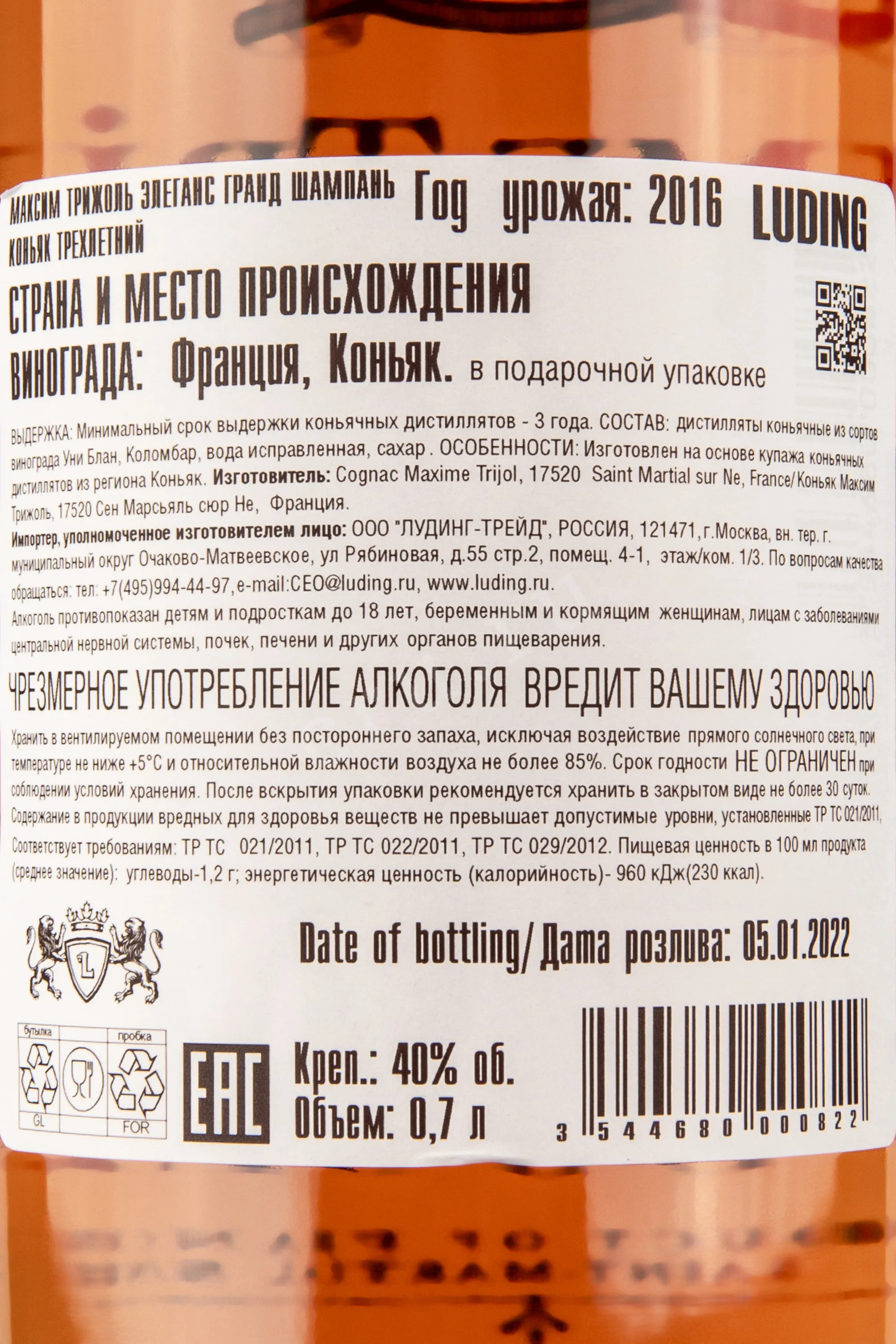 Коньяк Maxime Trijol Elegance Grande Champagne 0.7 л – качественный французский cognac, который создается стараниями лучших купажистов именитой компании Максим Трижоль. Производится из высококачественного винограда, растущего в регионе провинции Коньяк – Гран Шампань. Процесс созревания высококачественных коньячных спиртов проходит в лимузенских дубовых бочонках на протяжении 3 лет, в подвалах производителя. На международном конкурсе стал обладателем золотой медали и звания Cognac Producer of the Year. Коньяк поступает в стильной презентабельной коробке, станет отличным подарком на любое торжество.