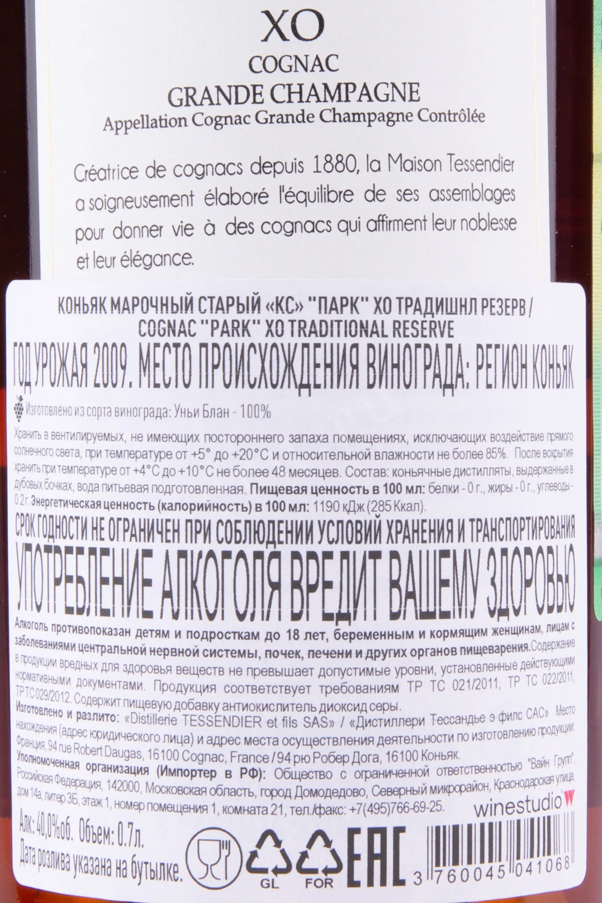 Коньяк Park ХО 0.7 л – напиток премиум-класса, который производится мастерами купажа известной коньячной компании Тессандье из лучшего сорта винограда, растущего в регионах провинции Коньяк – Гран Шампань, Фэн Буа и Пти Шампань. Купаж отборных коньячных спиртов высочайшего качества проходит длительный процесс созревания в бочонках из лимузенского дуба на протяжении 20-25 лет, в специальных погребах производителя. В 2011 году был удостоен награды Best of Class, Best of Show и золотой медали на международном конкурсе Los Angeles International Wine&Spirtis Competition. В 2012 стал обладателем золотой медали на конкурсе San Francisco World Spirits Competition. Премиальный cognac станет достойным подарком на любое торжество.