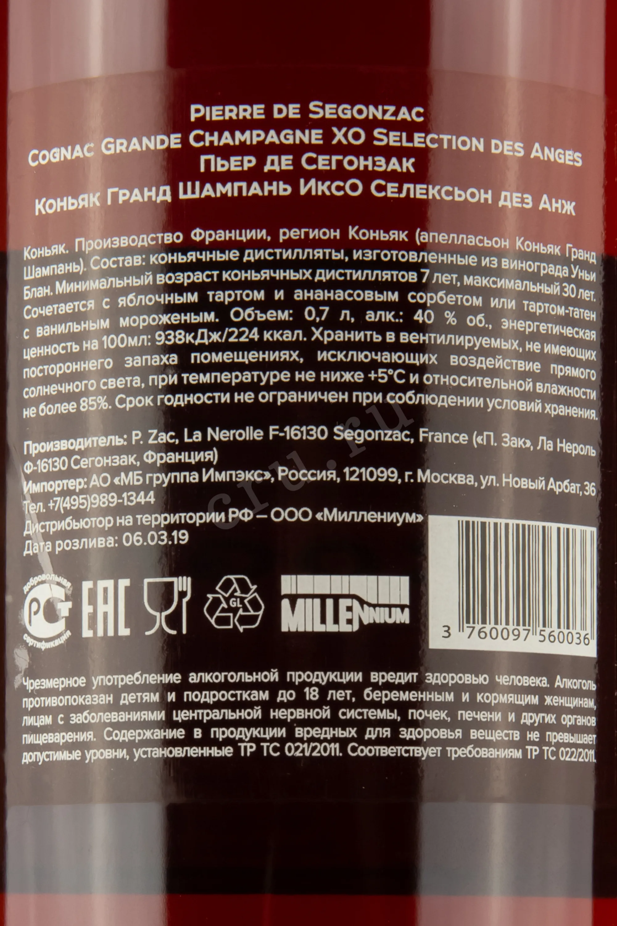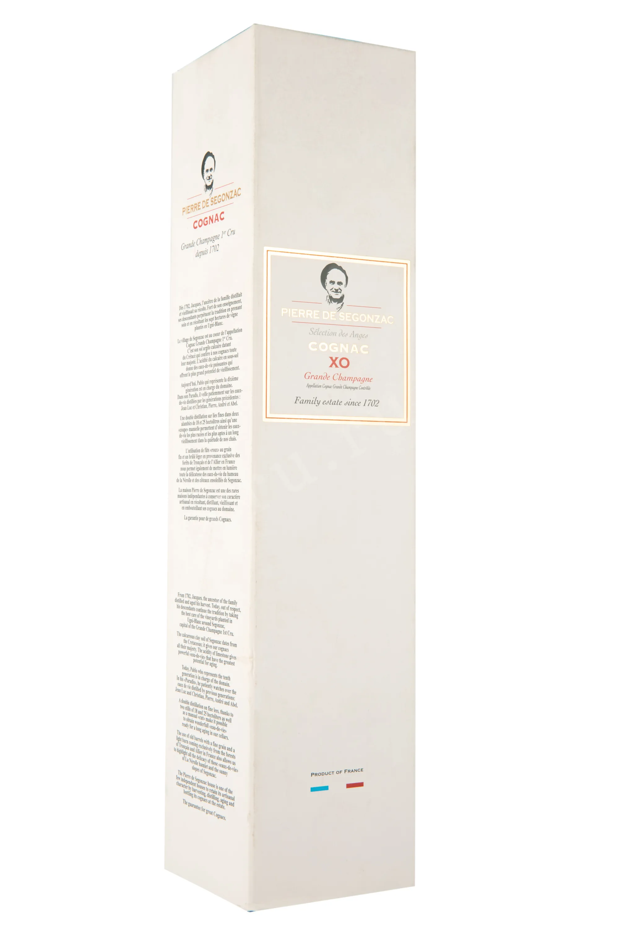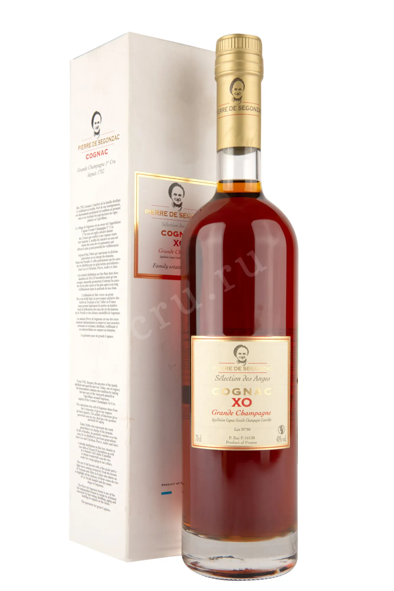 Коньяк Pierre de Segonzac Selection des Anges XO Grande Champagne 0,7 л в п/у представляет собой бленд из разновозрастных спиртов, для создания которых использовался сорт Уни Блан. Его выращивают на виноградниках престижного апелласьона Гран Шампань, собирают ручным способом и подвергают классической переработке. Дистилляты выдерживались в дубовых бочках 7-30 лет. Были тщательно отобраны лучшие из них для создания эксклюзивного купажа. Название переводится как «Отбор ангелов» - это намек на известное понятие «доля ангелов» (так обозначают испарившую во время выдержки часть спиртов). Элитный коньяк получил престижную награду на международном конкурсе. Он представлен в подарочной коробке и может быть преподнесен на какой-либо праздник.
