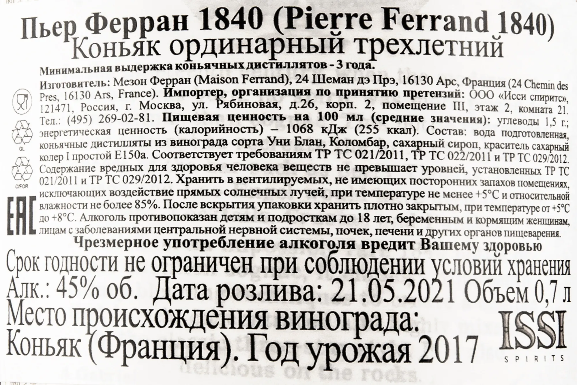 Коньяк Pierre Ferrand 1840 0.7 l – это французский алкоголь из урожая 2017 года, вдохновленный легендарной бутылкой Pinet Castillon 1840 года. Минимальная выдержка спиртов в купаже составляет 3 года. 45-процентный напиток является обладателем серебряной медали на дегустационном конкурсе в США.