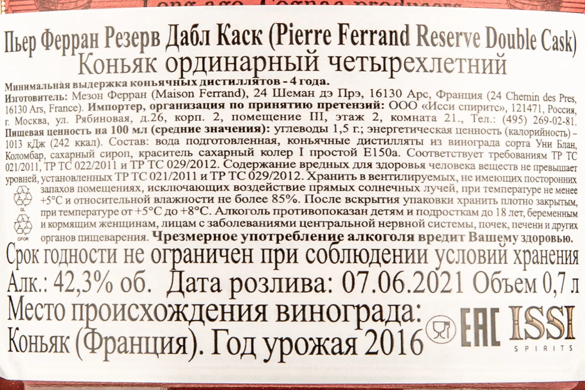 Коньяк Pierre Ferrand Reserve 4 years 0,7 л п/у – это ординарная вариация, созданная традиционным методом двойной дистилляции. На создание напитка пошли ягоды, созревшие в терруаре престижного апелласьона Гран Шампань, на плантациях уровня Премьер Крю. Ферментированное сусло перегнали в шарантском медном кубе, а полученные молодые спирты перелили в дубовые бочки, где оставили на четыре года для созревания.