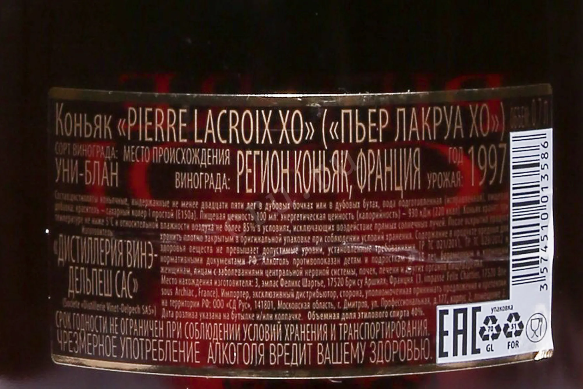 Коньяк Pierre Lacroix XO AOC 0,7 л в подарочной упаковке — великолепный представитель своей категории, отмеченный критиками и экспертами. Для производства использовался сорт Уни Блан, в основном 1997 года. Возраст спиртов в купаже достигает 25 лет, что делает характер коньяка невероятно сложным, выразительным и благородным. Спирты проходили длительную выдержку в бочках из гасконского и лимузенского дуба, затем были тщательно отобраны мастером погреба. Элитный алкоголь стильно оформлен и поставляется в элегантном гифт-боксе, что еще раз подчеркивает его высокий статус. Подобный подарок будет уместно преподнести по особенно торжественному поводу.