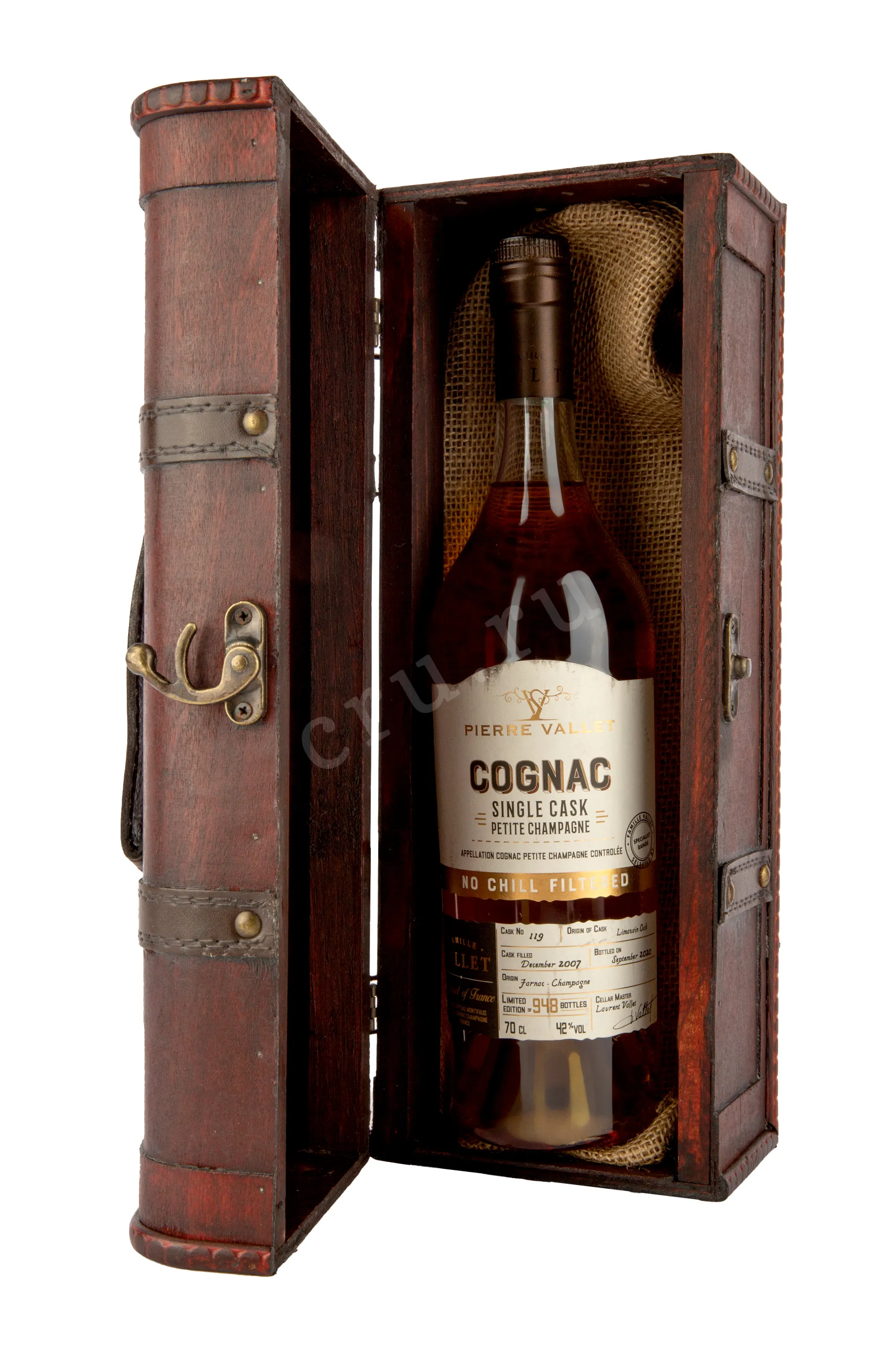 Коньяк Pierre Vallet Petit Champagne Single Cask gift box 0.7 l – это зрелый французский cognac, выпускаемый в необычных сувенирных боксах в форме сундуков. 42-процентный напиток изготовлен из винограда с региона Petit Champagne урожая 2007 года. Выдержка спиртов протекала в барриках из лимузенского дуба не менее 12 лет.