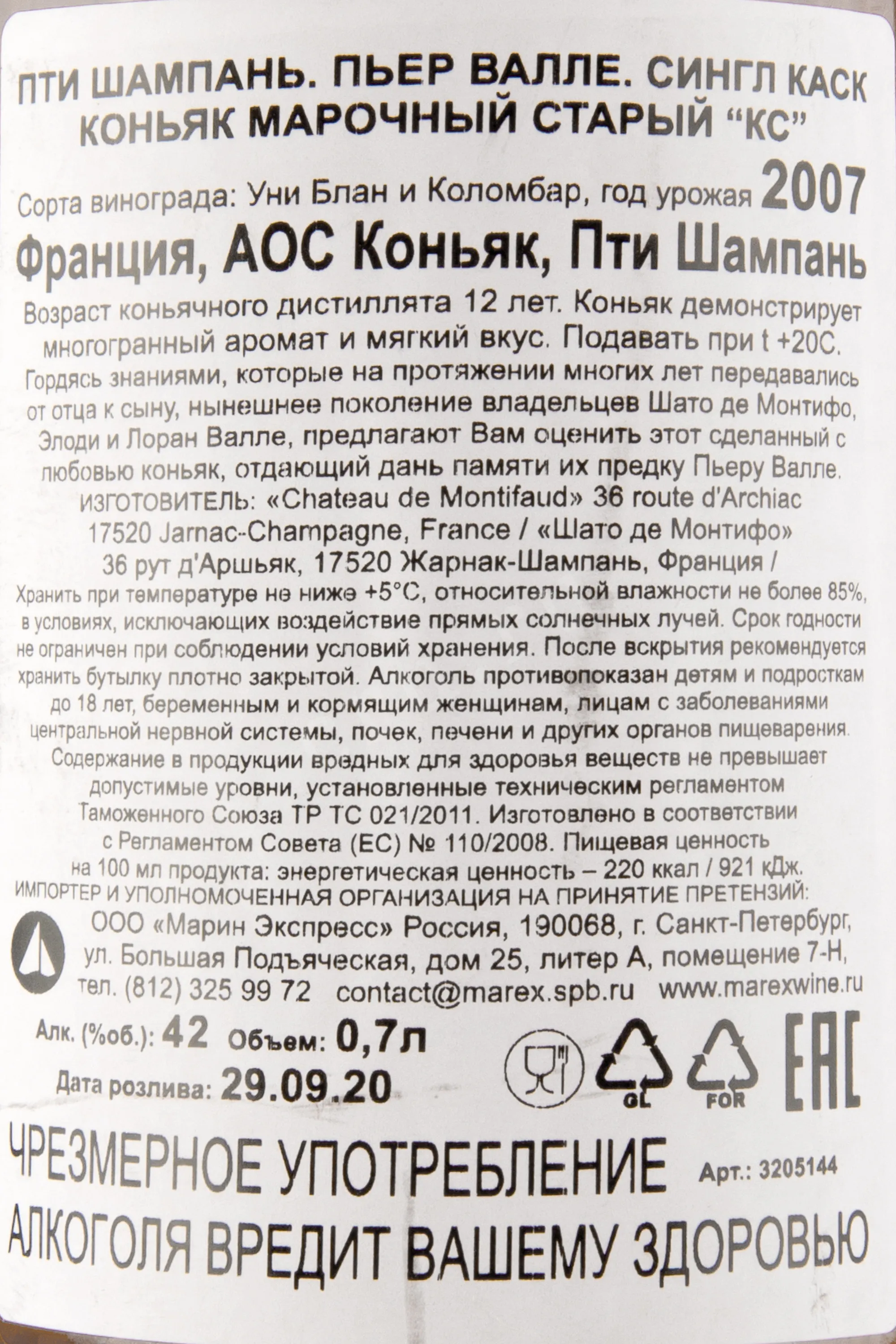 - Сорта винограда: Уни Блан, Коломбар.