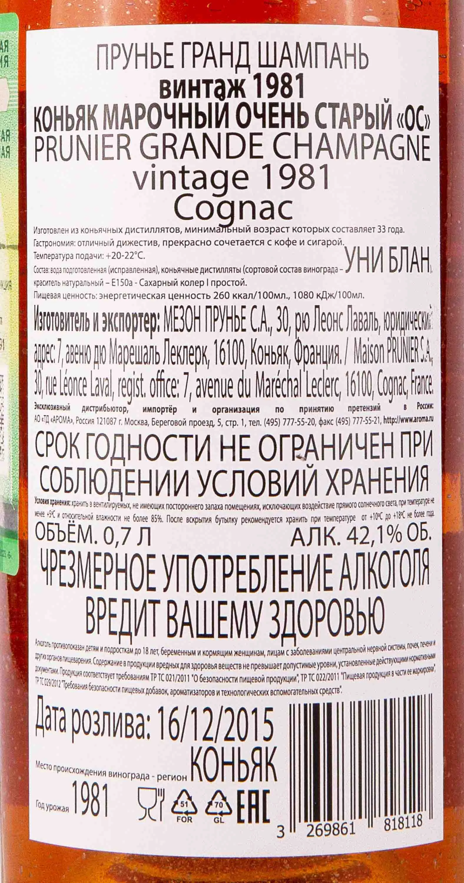 Prunier Grande Champagne 1981 0.7 л купить коньяк Прунье Гранд Шампань Винтаж цена в магазине КРЮ ПРОФИ г. Москва, ул. Профсоюзная, д. 16/10 10:00-22:00 Ежедневно +7 (495) 920-20-02 info@cru.ru