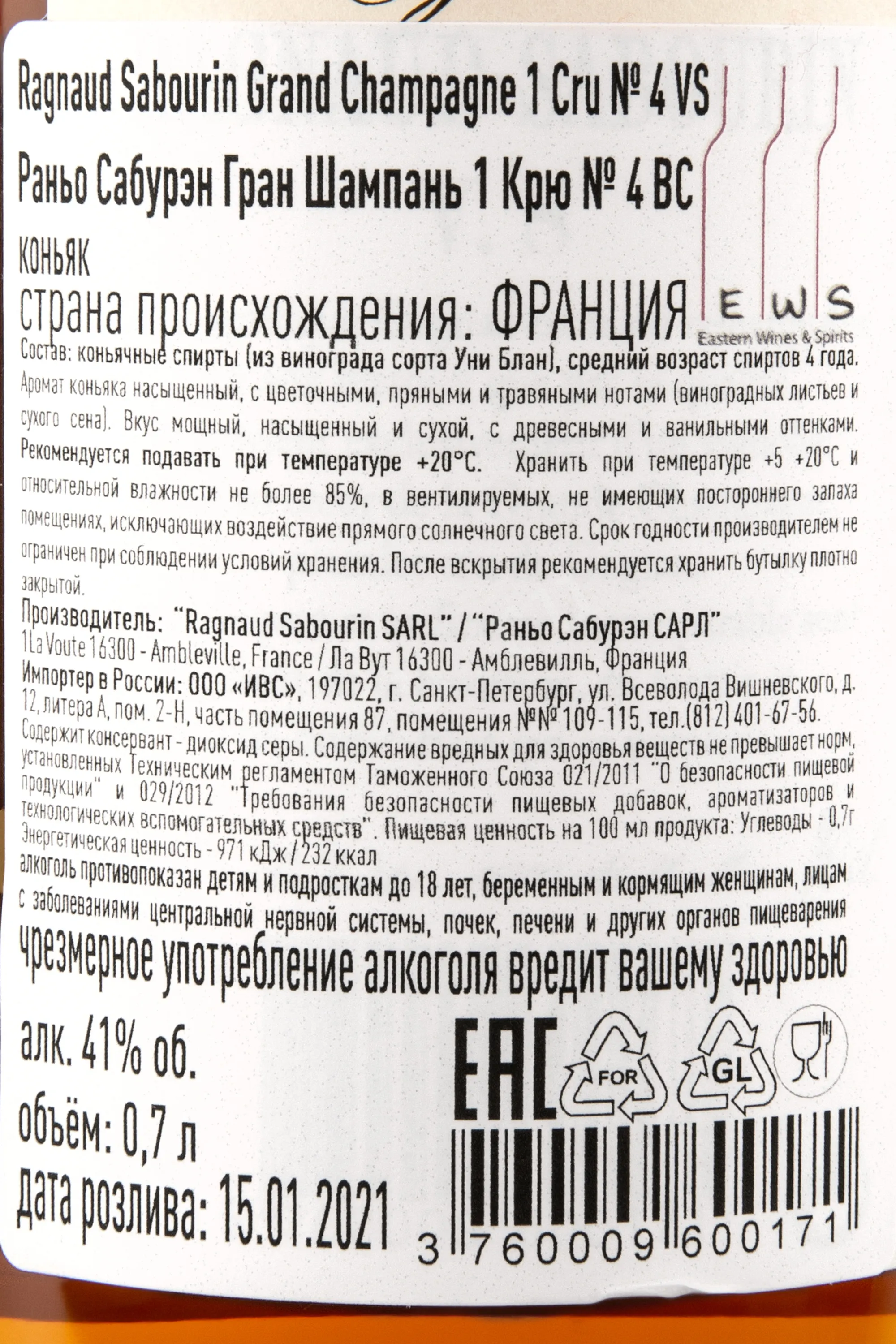 Коньяк Ragnaud-Sabourin №4 VS Grande Champagne gift box 0.7 l – это молодой представитель коллекции французского бренда, выпускаемый в сувенирном боксе. Изготавливается cognac из винограда одного сорта, культивируемого в регионе Grande Champagne. 41-процентный напиток выдерживается не менее 4-х лет в барриках из лимузенского дуба.
